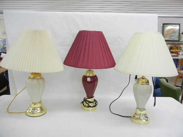 Pair of off white lamps & 2 Mauve Lamp all matching base