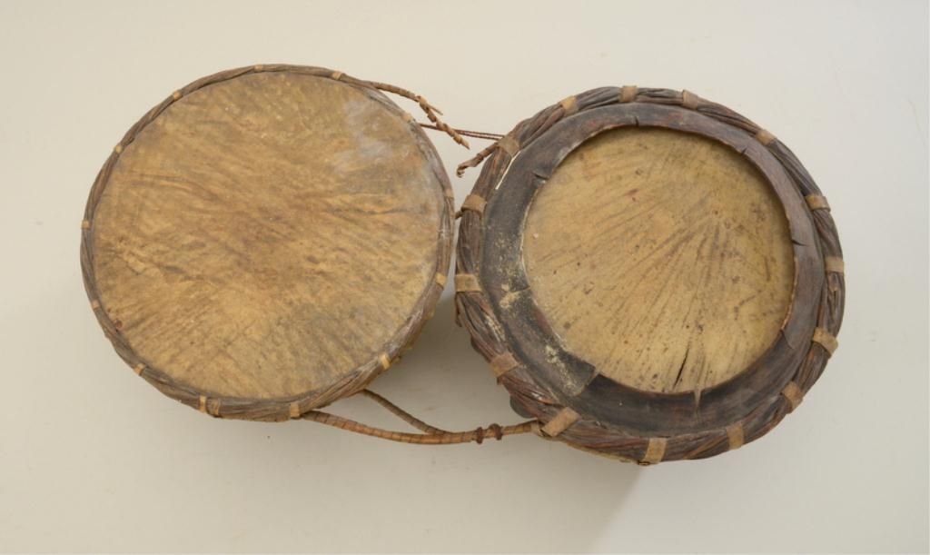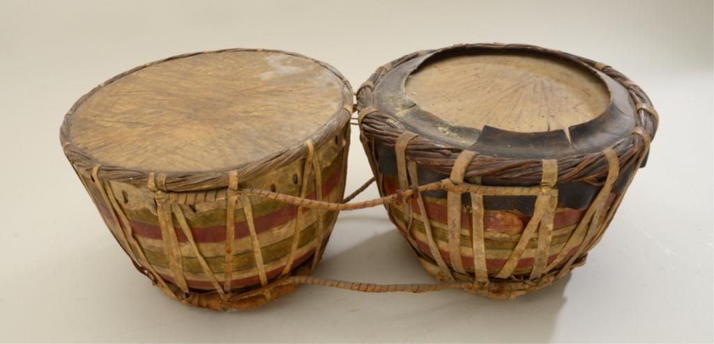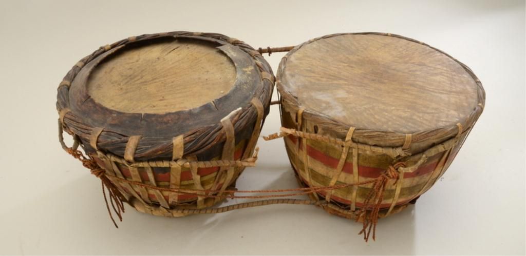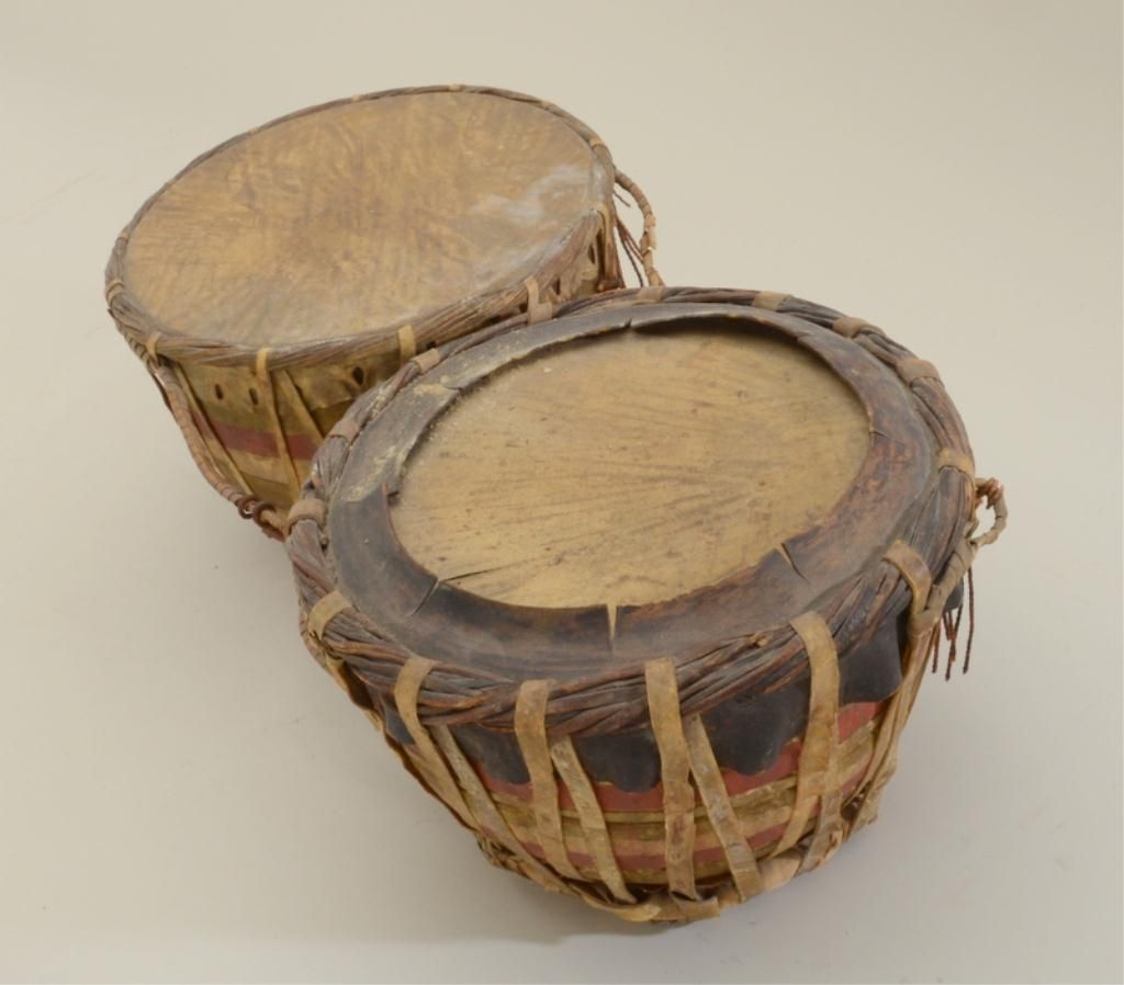 Pair of old drums, each approx. 11” in diameter and each approx. 9” in height, hide or sinew strips attach tops and bottoms to the drums, bodies are painted in horizontal panels of white, red and light brown; tops of drums are still tight, bottom area is trimmed in trade cloth. Consignor indicates these drums were obtained by his father in the late 1940s from the Los Angeles Southwest Museum; should be further researched. Est.: $400-$800.