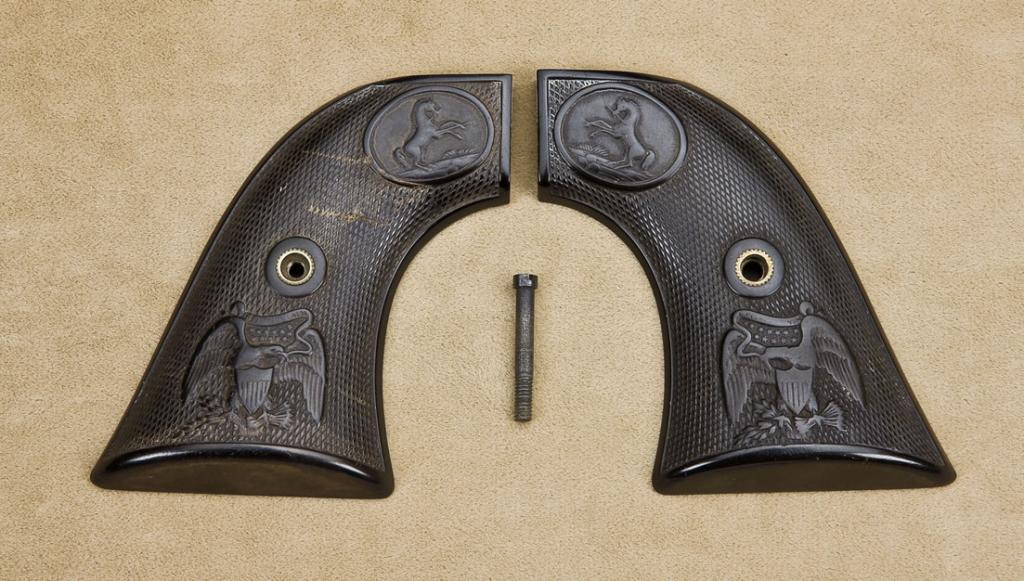 Pair of original Colt checkered eagle hard rubber black grips for a SAA revolver in overall good condition showing wear and some scratching on the right grip mid-way between the Rampant Colt and screw escutcheon. Scarce to find original spare eagle grips in any condition. Est.: $100-$200.