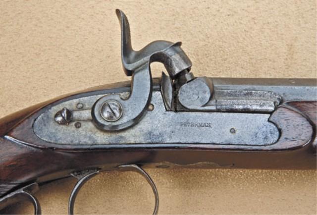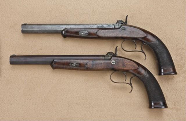 Pair of percussion American single-shot dueling pistols stamped “Peterman” on locks, approx. .50 caliber smoothbore, with 9-1/2” medium to heavy weight octagon barrels, 68” overall. Brown plain iron mount. Brown patina finish. The pair remain in good condition. One pistol shows some original brown going to patina. Traces of case hardening on lock. Good wood with crisp checkering, some small dings and minor imperfections but generally very good overall with crisp lock. The mate shows s pitting on the barrel and lock, a slightly darker color. Generally good metal surfaces with good stock showing some small losses, wear at the edges, normal use. A completely original as-found condition. From the William R. Orbelo Collection. Est: $3,500 - $7,000
