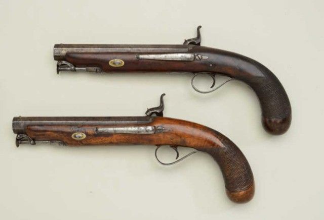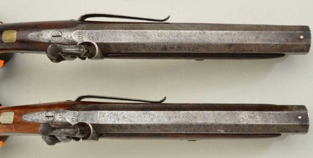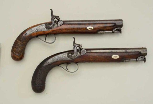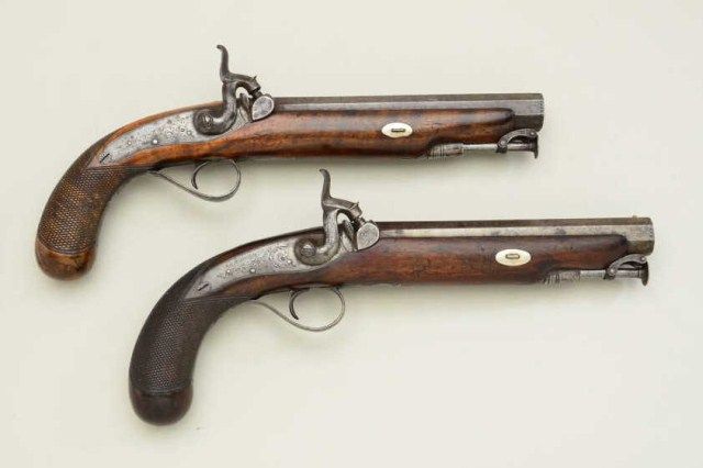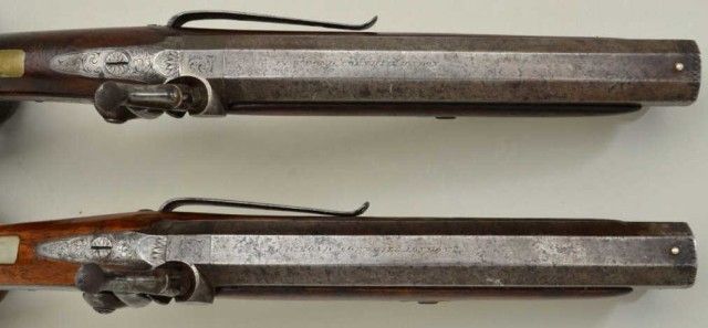 Pair of percussion belt pistols by E & H Bond of London showing back action locks, swivel ramrods and belt hooks. The pair are approx. 65 cal smooth bore and measure 13-1/2” overall. The pair show gray to brown patinafinish with traces of original brown and case hardening. Some light to moderate pitting. The stocks are good to very good with fairly sharp checkering, both actions work. The pair are contained within a modern madedisplay case with antique flask and accessories which displays nicely. Est.;$1,500-$3,000.