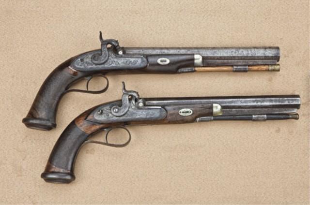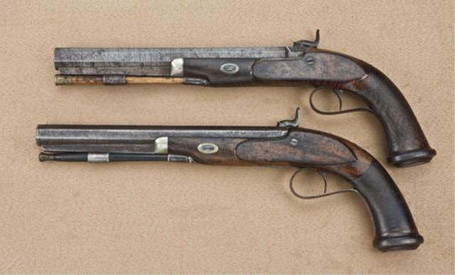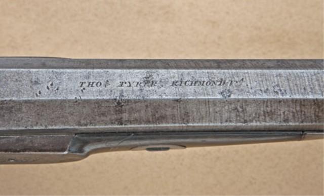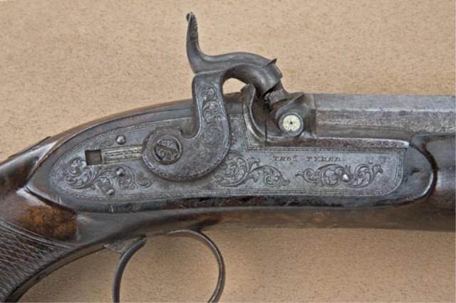 Pair of percussion dueling/target pistols. Signed Thomas Tyrer on barrels and locks, and Richmond VA on barrels. Circa approx. 1834. The pair measure approx. 16-1/4” overall with 10” medium to slightly heavy weight barrels of approx. .50 caliber smoothbore. The pair are half-stocked with iron triggerguard, German silver trim. The pair remain in fair to good original condition showing a deep grey to brown patina finish. One pistol is considerably better and shows approx. 50-60% striping, some light to moderate erosion and pinprick pitting. The thumbpiece has been sheared off. Traces of case hardening going to grey brown on lock and breech. Good sharp engraving, good wood showing pronounced grain, some smoothing to the checkering, a couple of bumps, small losses, and minor imperfections. The triggerguard and buttplate show traces of original color. An original to the period brass tipped wood rammer is included, and the lesser pistol of the pair shows a grey to brown patina finish, light to moderate erosion and pinprick pitting. Some marks at the edges of the barrel, and slight trace of Damascus pattern. The stock show some even wear, discoloration, darkening, smoothing to the