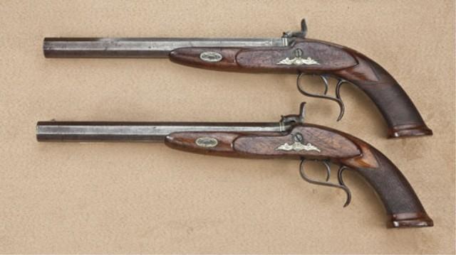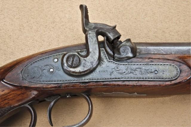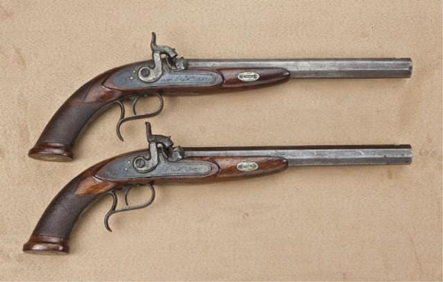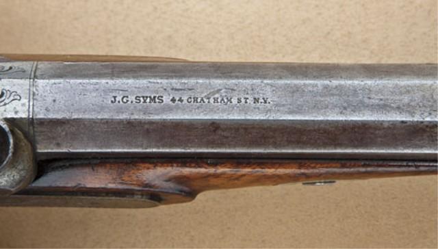 Pair of percussion dueling/target pistols signed J. G. Syms 44 Chatham St. New York marked on both lock and barrels. 17-7/8” overall with 11” slightly heavyweight barrels of .50 caliber smooth bore. The pistols are half-stocked with adjustable set triggers, engraved iron scroll triggerguards, wood stocks with German silver mounts and inlays. The barrels show 30-40% original brown drifting to patina in grey. Some marks, scratches, erosion and pinprick pitting just starting. The locks show 30-50% case hardening. One hammer shows an old repair at the top. The stocks are good with some age checks and one or two cracks, some small storage marks, nicks, scratches, mostly in the varnish. The checkering is still good. The butts are inlaid with German silver engraved shields. There is a large stag head inlaid into each wrist at the top that are nicely engraved. The balance of the German silver is also engraved and the iron triggerguards are engraved in simple florals of vignettes of birds on the guards. A good looking pair of American pistols, circa approx. 1850’s. From the William R. Orbelo Collection. Est: $3,000 - $6,000