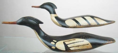 Pair of racy red breasted mergansers by a Canadian maker in the old style. Lead weights on the bottom of both. Wear as intended by the maker. Glass eyes. (decoy)