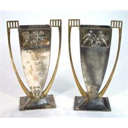 Pair of rectangular based WMF twin handled and silver plated vases moulded with panels of Roman g…