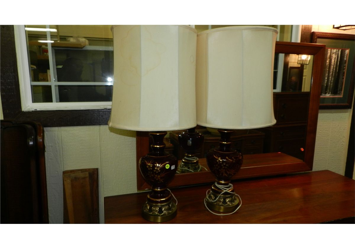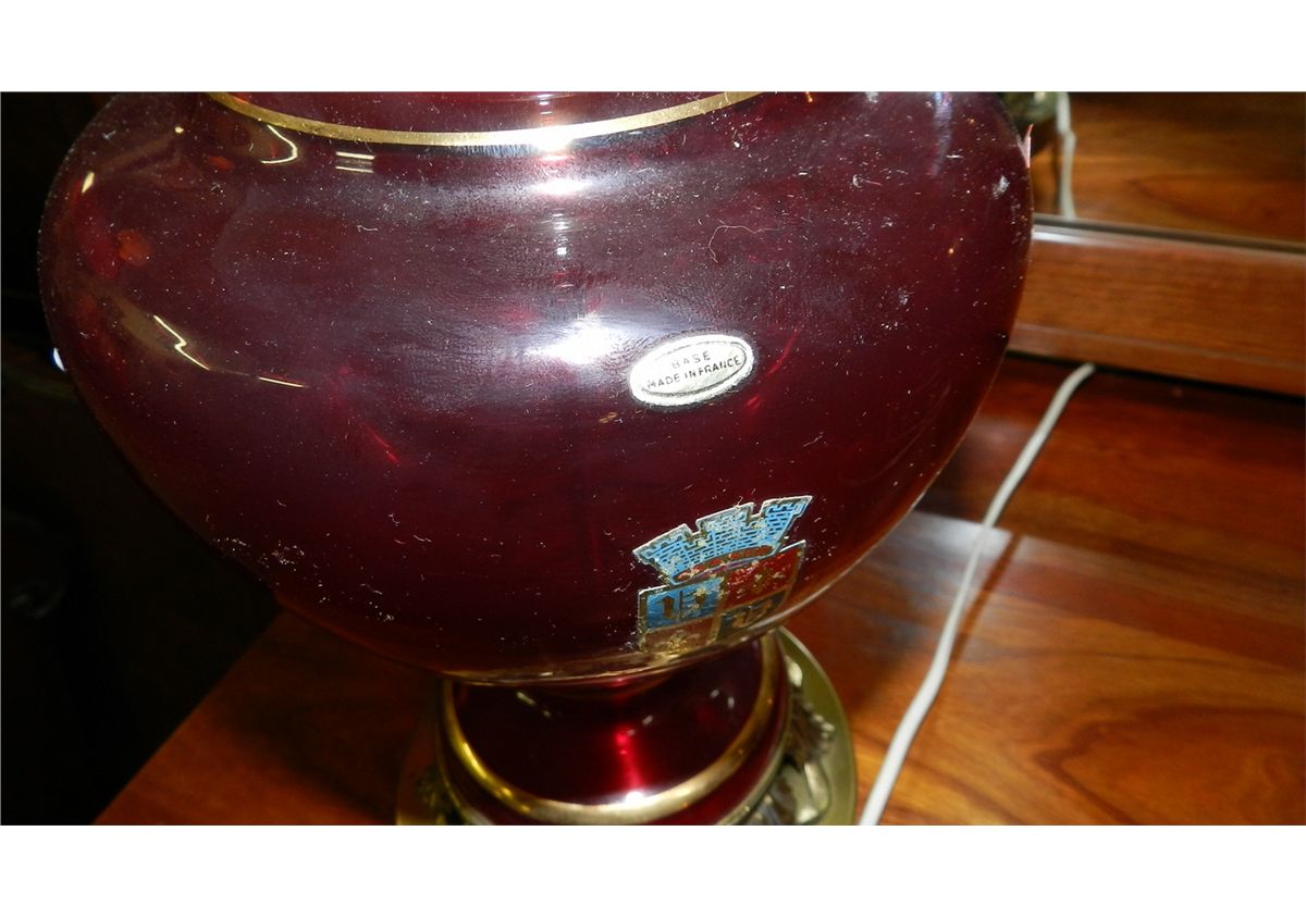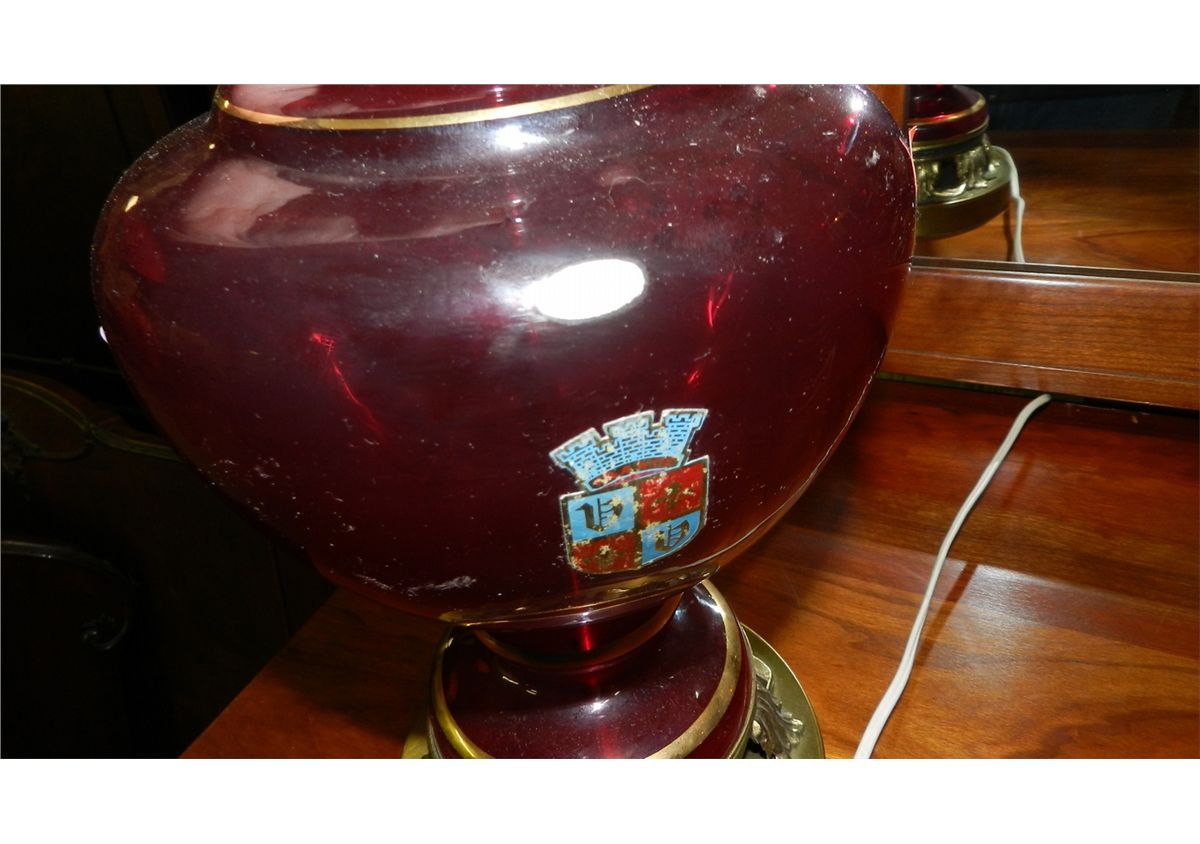 Pair of ruby cut and gold painted lamps, made in France, shades as found, light staining