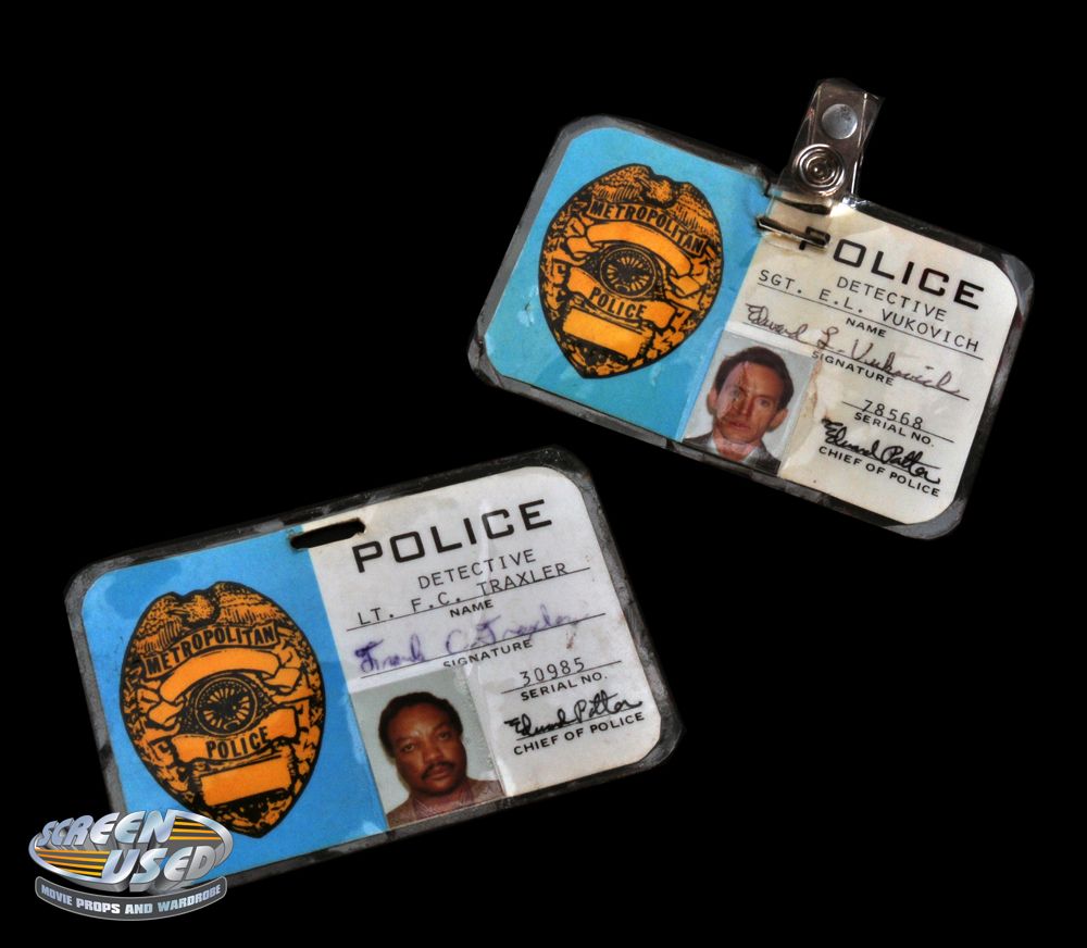 (Hemdale Film, 1984) These police IDs were used on screen by Lance Henriksen, as Sergeant Hal Vukovich, and Paul Winfield, as Lieutenant Ed Traxler. These were the only IDs made for these characters and were acquired directly from the Property Master of the film. Accompanied by two hand-signed letters--one for each ID--from the Property Master explaining they were made by him and are one-of-a-kind.