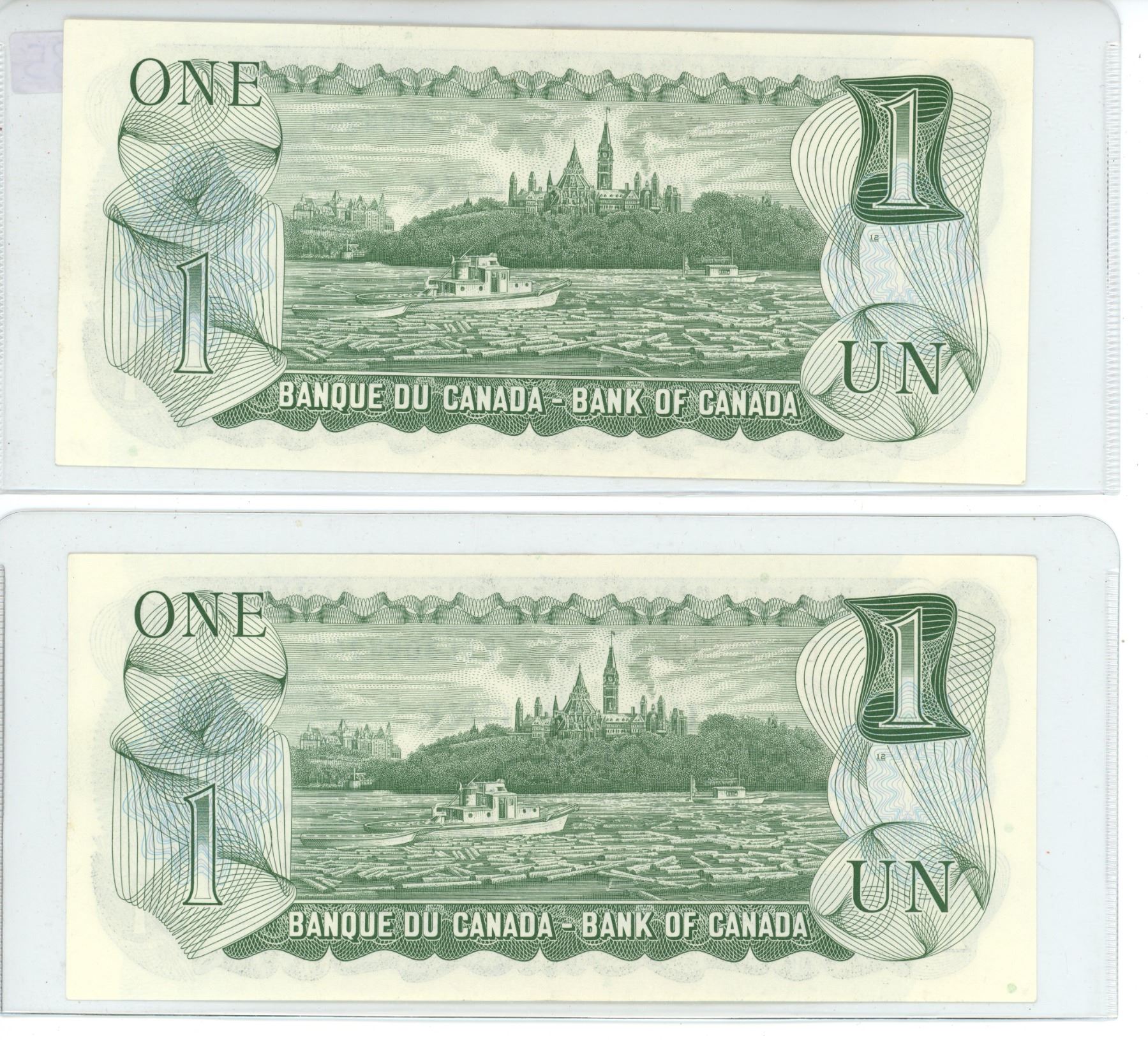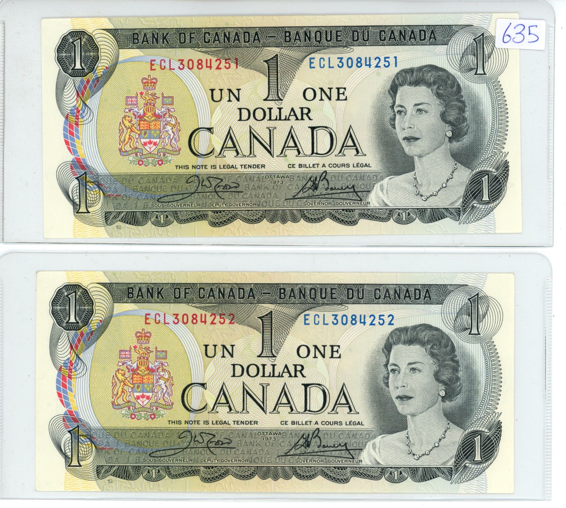Pair of sequential, 1973 Canadian 1 dollar bills - Crow/Bouey - Prefix ECL 3084251-52