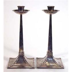 Pair of silver Arts and Crafts square based candlesticks with riveted effect, JD&S, Sheffield, 1907, 24cm high