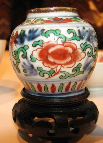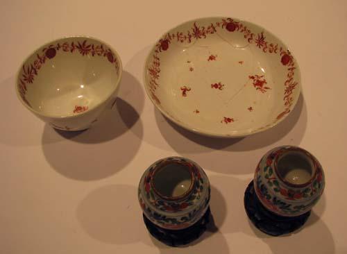 Title: Pair of Small Chinese Porcelain Urns with cup and saucer (broken and repaired)