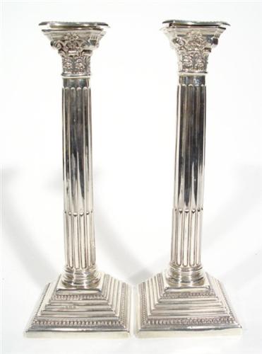 Pair of square based reeded column candlesticks with acanthus moulded sconces, Birmingham 1956, eac