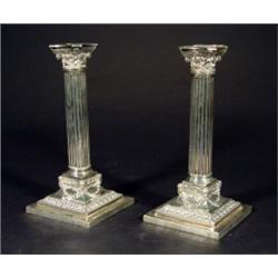 Pair of square based silver plated Corinthian column reeded candlesticks with ram's head and swag mouldings, 24cm high