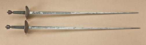 Pair of swords including two Dueling rapiers marked Fabrica de Toledo 1870 on blades, 43” overall, 36” blades, pierced steel cup hilts, wire wrapped sharkskin handles, with bowl shaped pommels. The swords show wide reinforced piercing blades, measuring approx. 3/4 across ricassos with a reinforced median ridge good condition scattered light to moderate pitting some darkening no cleaning. Grips show wear and use and are at least good. The blades are nicely" tempered and they are suitable for a serious challenge. With display plaque. Est: $6,000 - $12,000