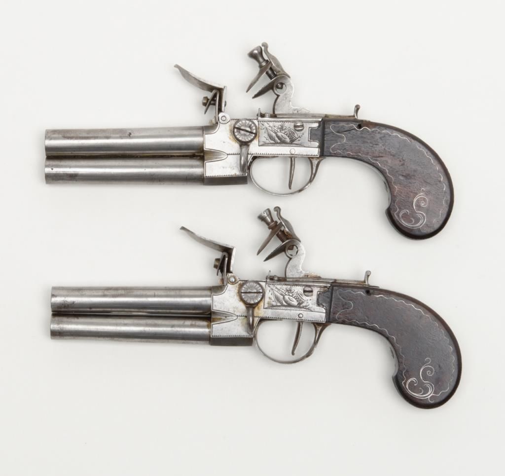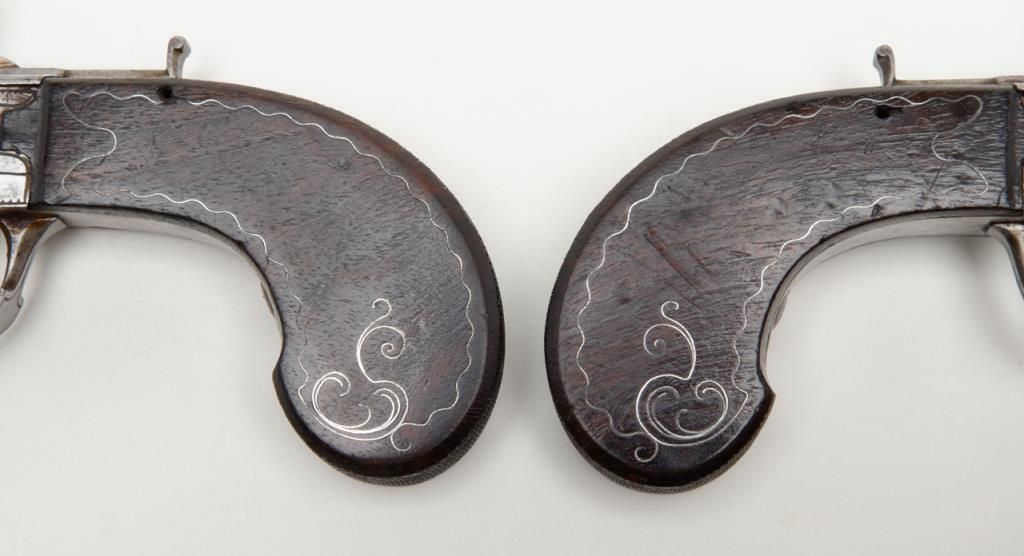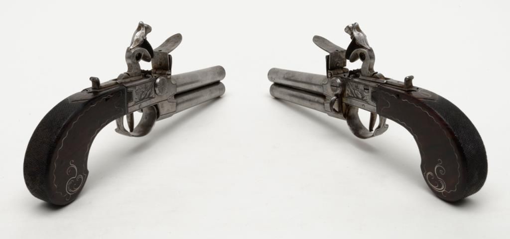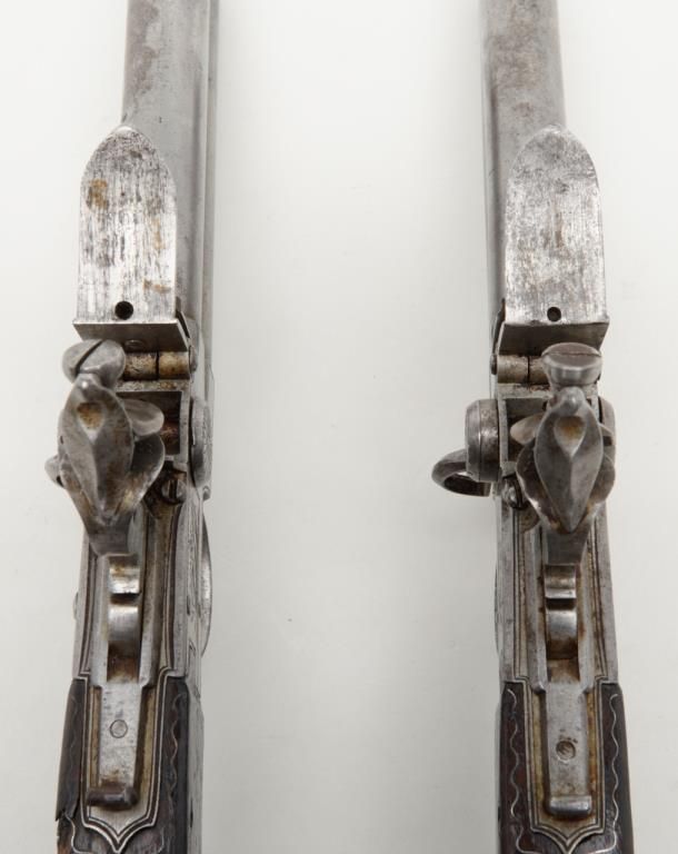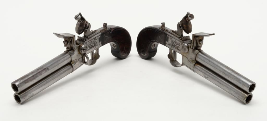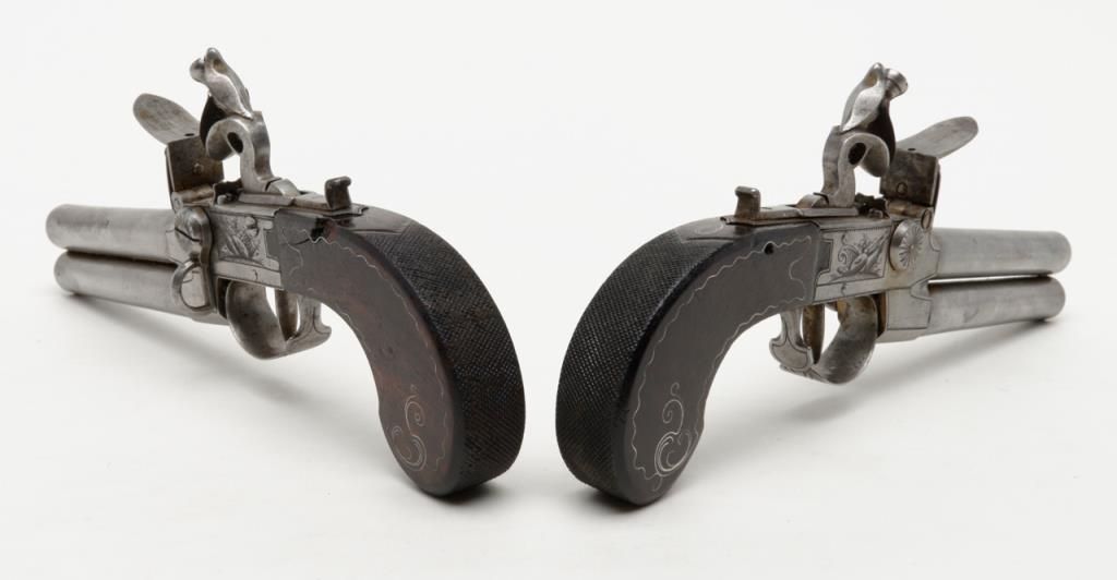 Pair of tap action over and under flintlock pistols of continental origin in very good plus original condition circa early 19th century. The pair measure 10 ½” over all with 3 and nearly ½” barrels of approximately .41 caliber smoothborewith false right-click. The action has a lever which allows the firing of either one or two barrels like the tap on the water faucet hence the name tap action. The metal surfaces show their original bright or coin finish and just someslight staining and minor beginning aging with super sharp original engraving. The stocks show a silver wire trim with checkered backs. The stocks are very good plus with just one or two small losses around the pinholes and some minor normalaging. A very crisp and attractive pair that are normally only found in singles. Est.: $1750-$3500