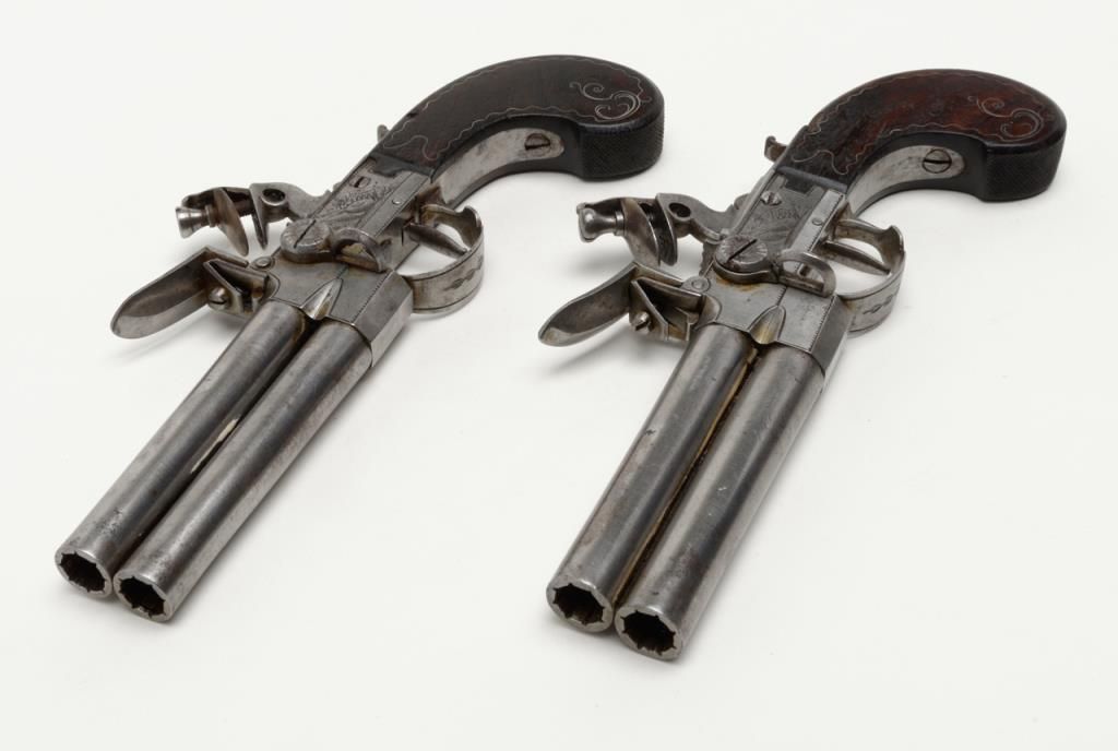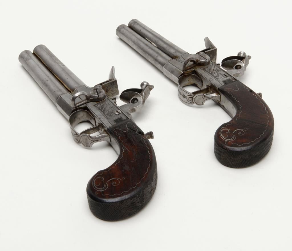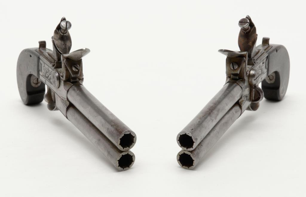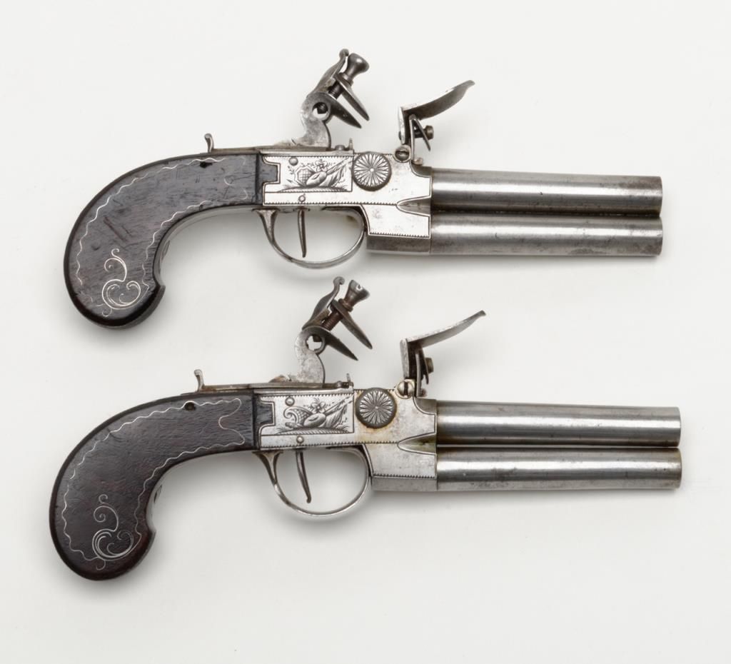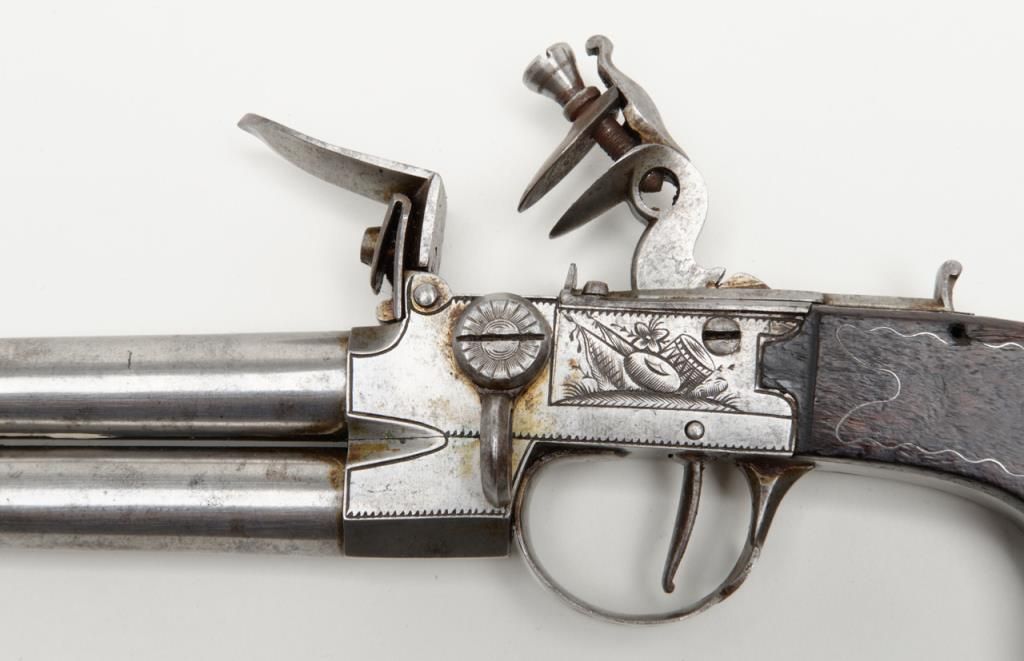 Pair of tap action over and under flintlock pistols of continental origin in very good plus original condition circa early 19th century. The pair measure 10 ½” over all with 3 and nearly ½” barrels of approximately .41 caliber smoothborewith false right-click. The action has a lever which allows the firing of either one or two barrels like the tap on the water faucet hence the name tap action. The metal surfaces show their original bright or coin finish and just someslight staining and minor beginning aging with super sharp original engraving. The stocks show a silver wire trim with checkered backs. The stocks are very good plus with just one or two small losses around the pinholes and some minor normalaging. A very crisp and attractive pair that are normally only found in singles. Est.: $1750-$3500