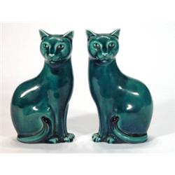Pair of turquoise glazed seated Poole pottery cats, marks to base, 18cm high