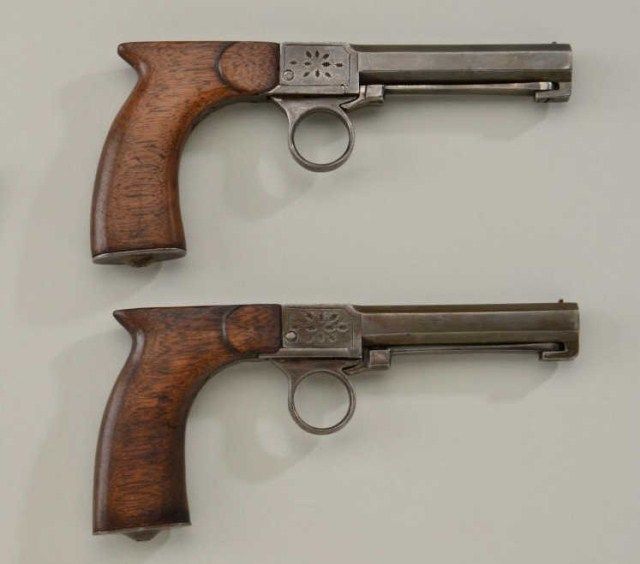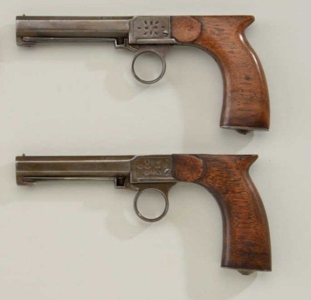 Pair of under hammer percussion target pistols of French style signed “J. Hermad” on top of each frame. The pair measure 7-1/4” overall with 3” octagon barrels of approx 26 cal. rifled. The ring trigger cocks a spring mounted on the bottom of barrel which doubles as firing striker. This ingenious and simple design allows the spring to move to the side for re-engaging the trigger. The barrels are crown “N” proofed with fleur delis. The pistols remain in very good condition with a light patina and very good wood stocks. Est.;$1,750-$3,500.