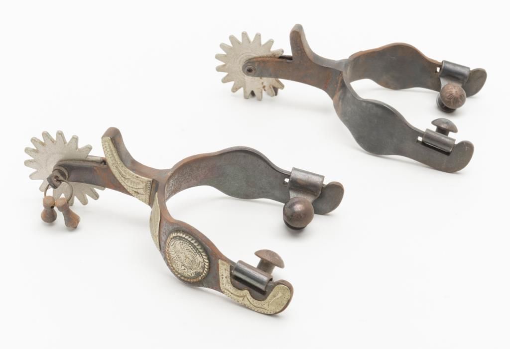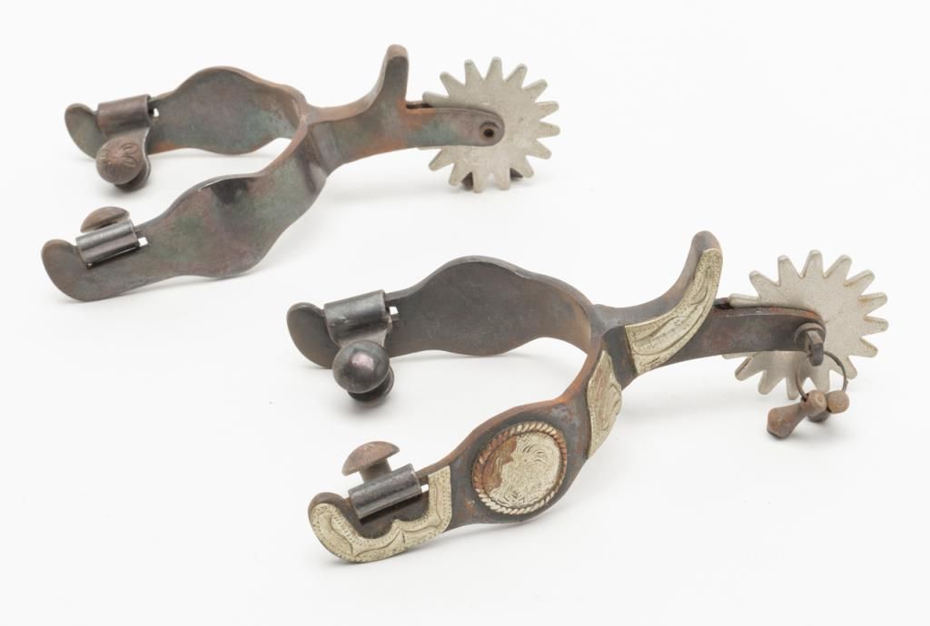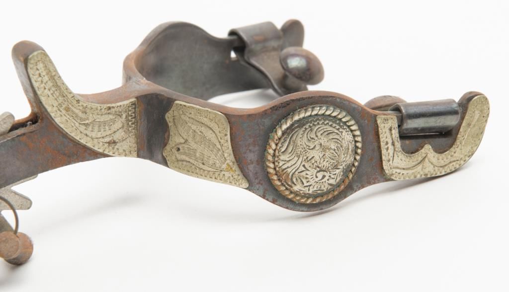 Pair of unmarked Mexican style spurs with engraved silver panels, medium size rowels and jiggle bobs; overall good condition. Est.: $150-$300.