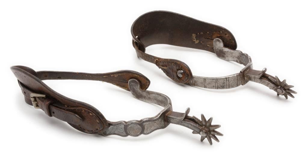 Pair of unmarked silver engraved and inlaid spurs with 1-3/4” 10 point rowels and two-piece old leather straps. Classic appearance. Est.: $350-$700.