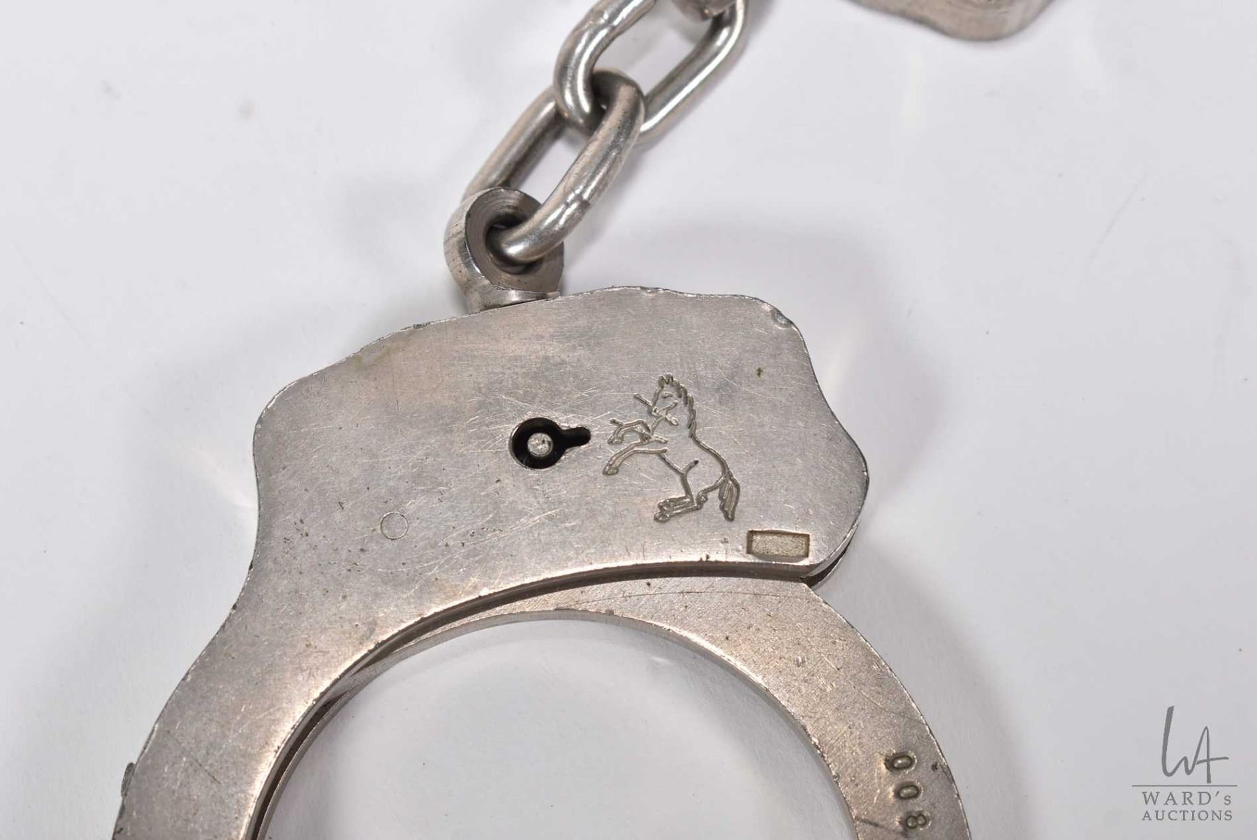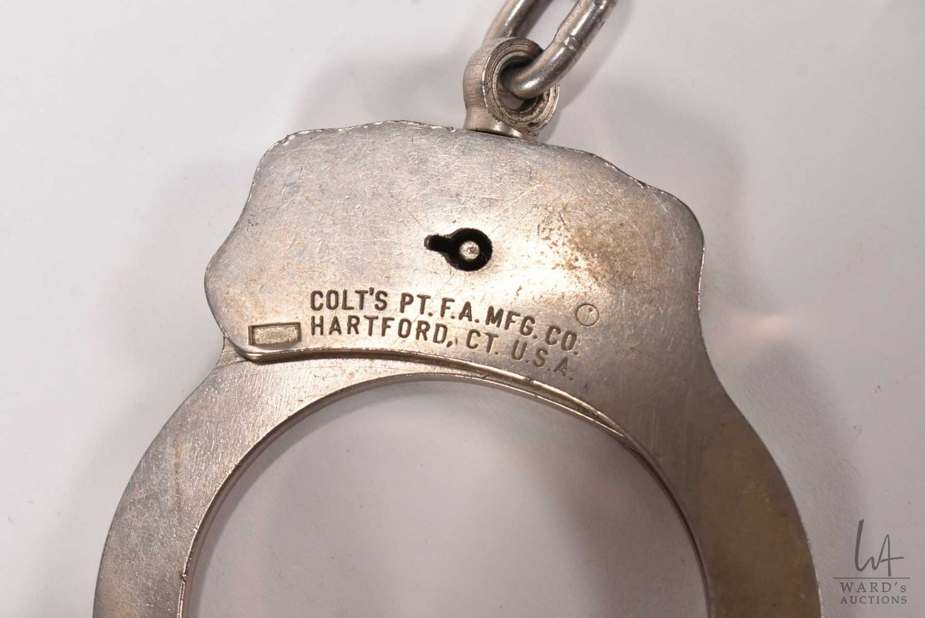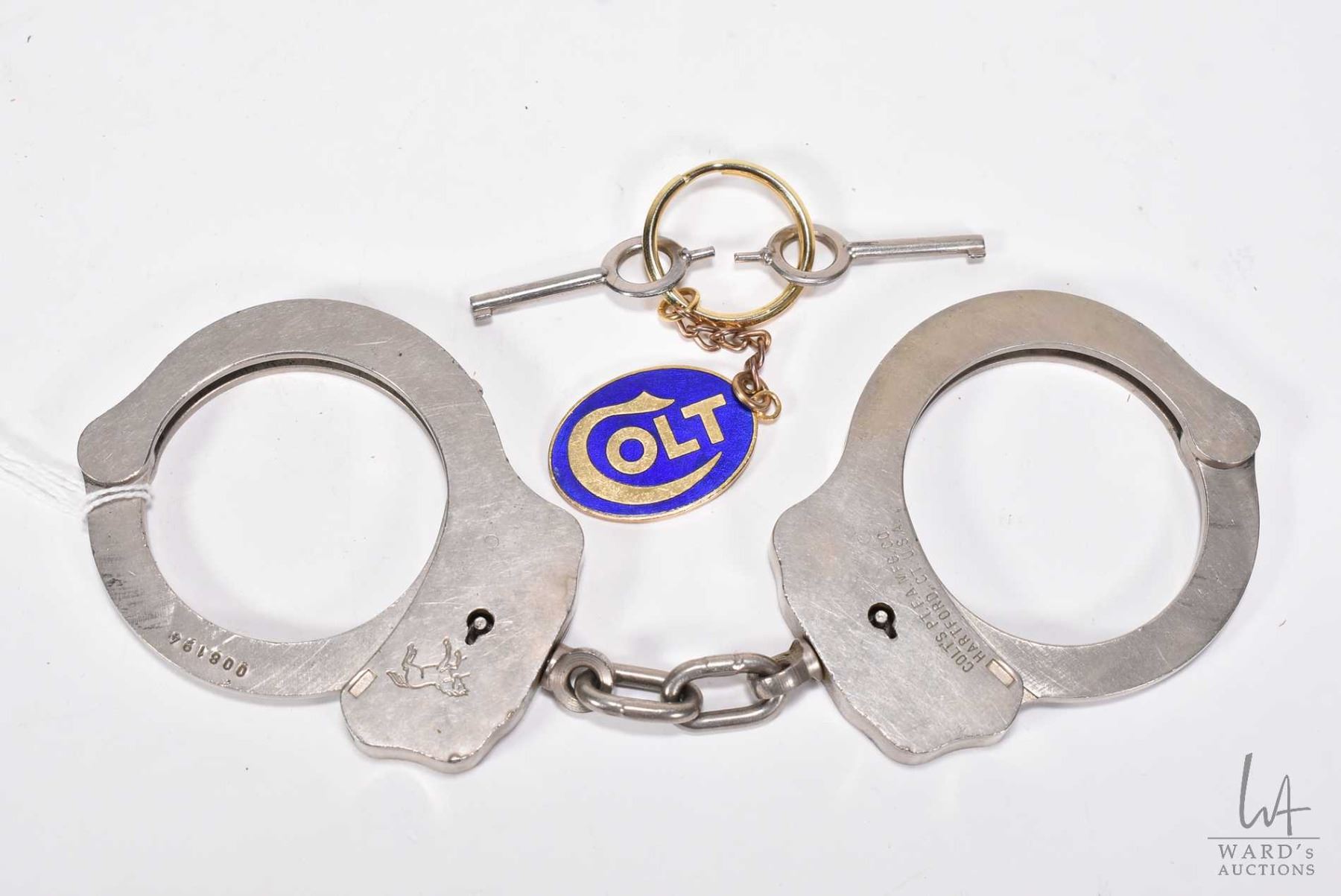 Pair of vintage genuine Colt Firearms handcuffs, serial no. 008194 with two keys and a Colt keychain