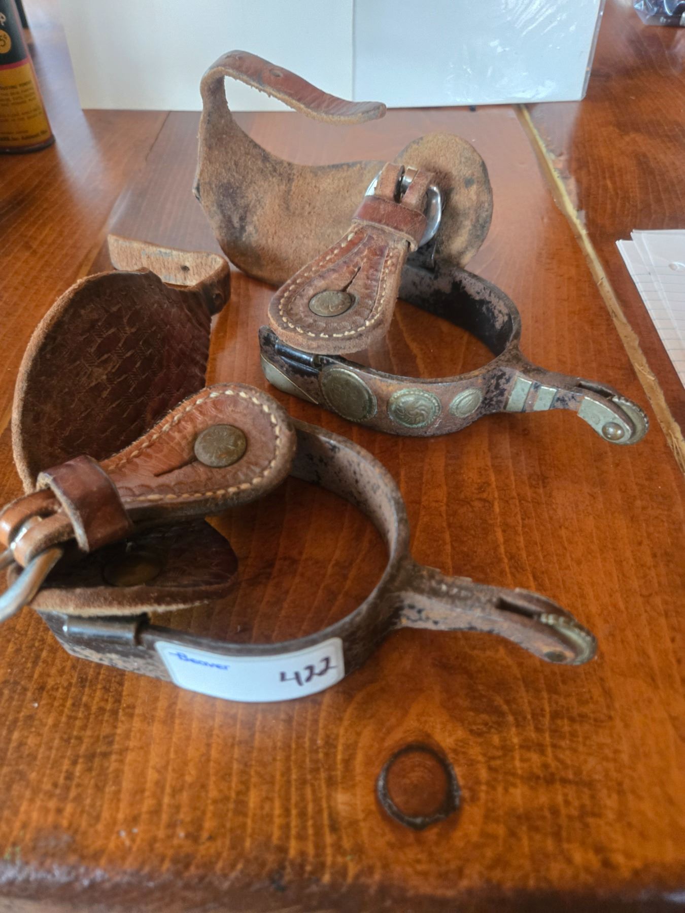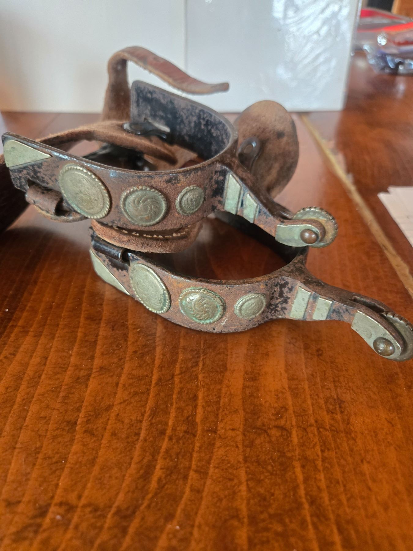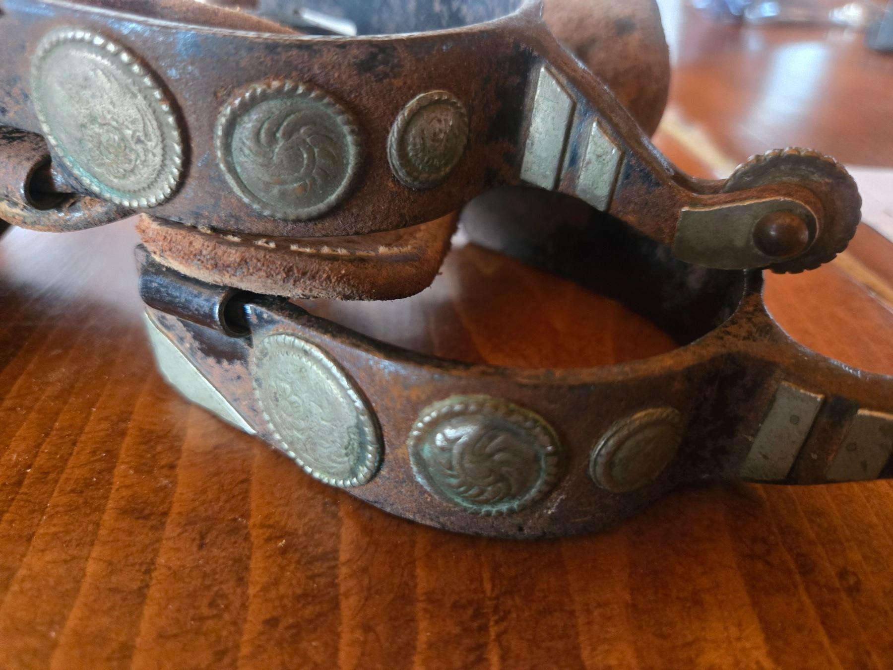 Pair of vintage spurs with silver circle inlay decorations. In good condition