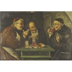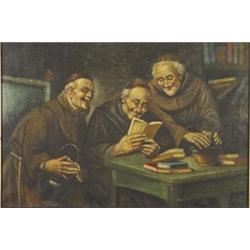Pair of well detailed unsigned oil onto canvas of monks drinking and reading, both in oak frames, each 24cm x 34cm