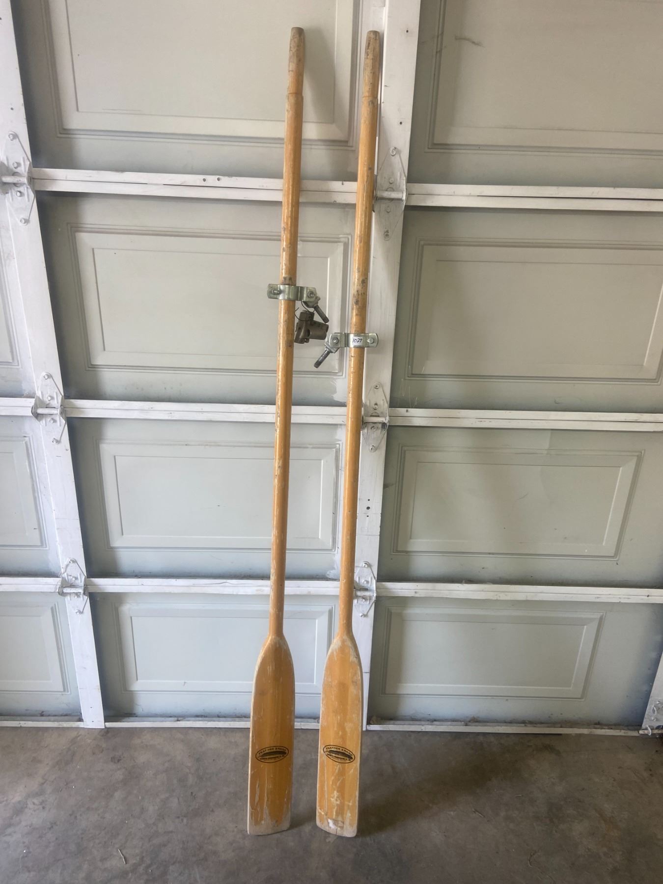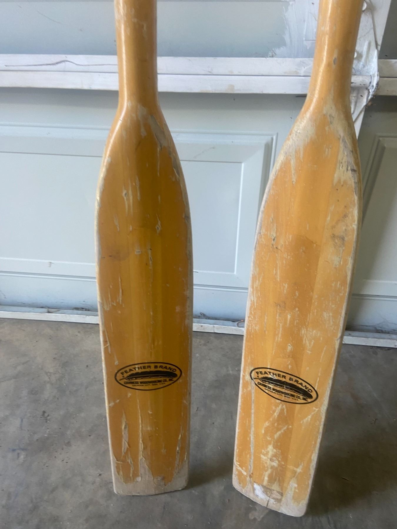 Pair of wooden oars - feather brand, comes with rowing brackets - 77" long