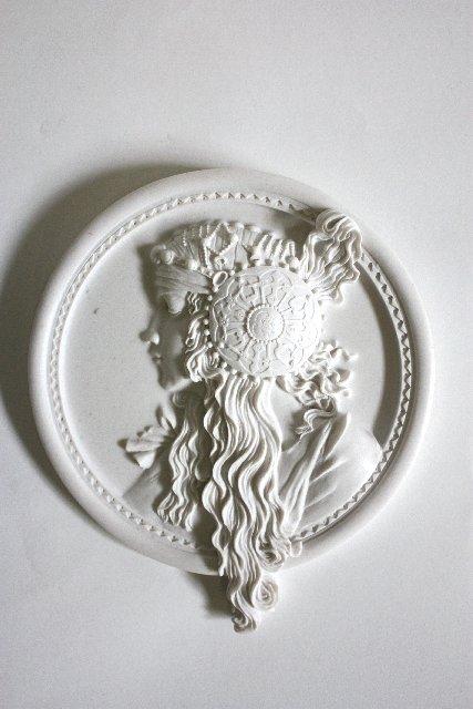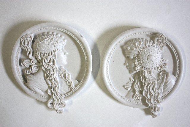 Pair round figural wall plaques
