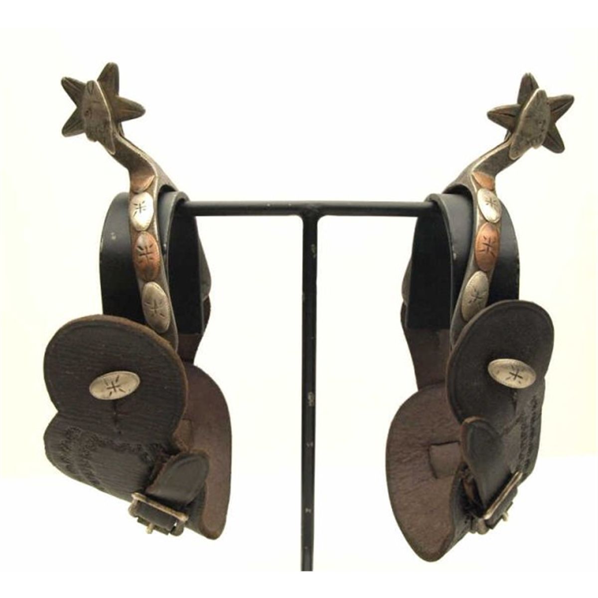 Pair single mounted eagle head spurs with 5 point rowels, stamped #1 in inner heel band area, includes unmarked leather straps.
