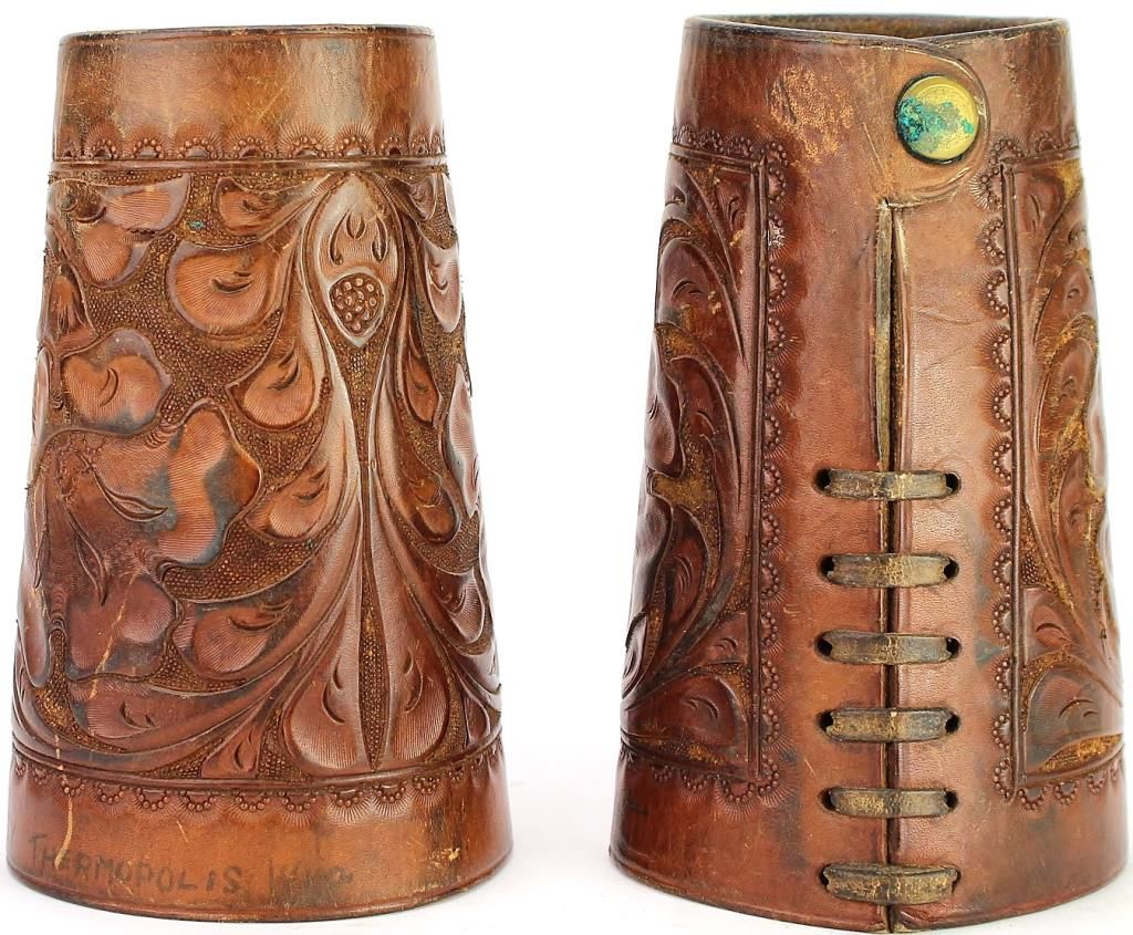 Pair tooled leather cowboy cuffs with good snaps and nice patina.
