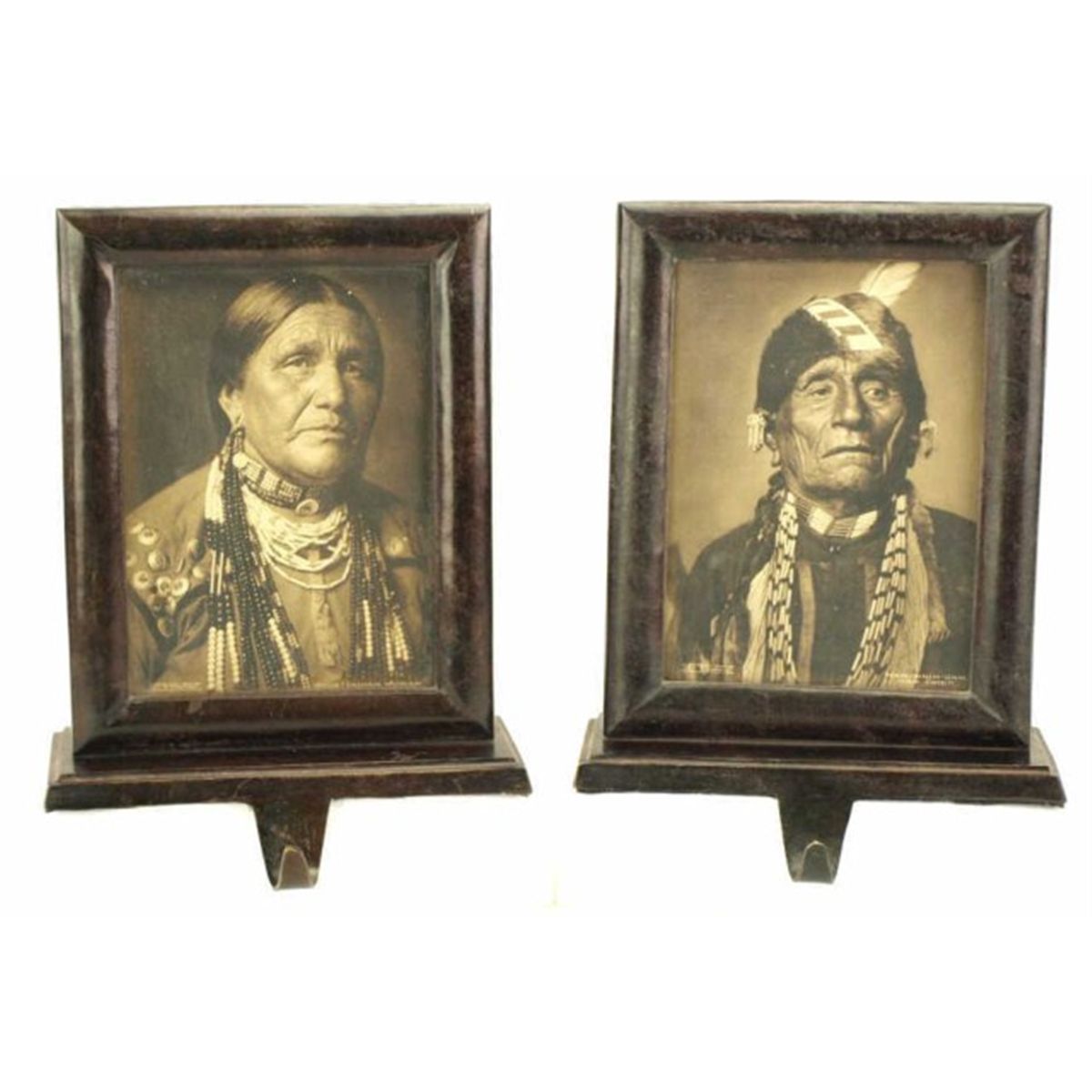 Pair vintage frames made of heavy iron designed with hooks for hanging, both with vintage clipped photos including Wah-Shlin-Gah-Kaw-Chief and Otoe Indian Woman, 5" X 7" opening size.