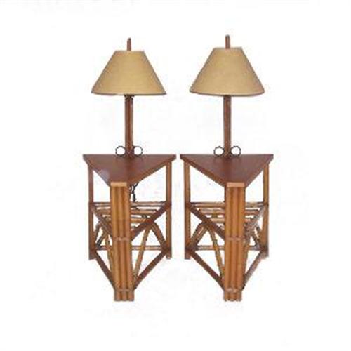 Fine & rare pair of wedge end tables with lights, restored. (key: tropical, Hawaiian, coastal, outdoor furniture, mid century, modern, retro, vintage rattan furniture)