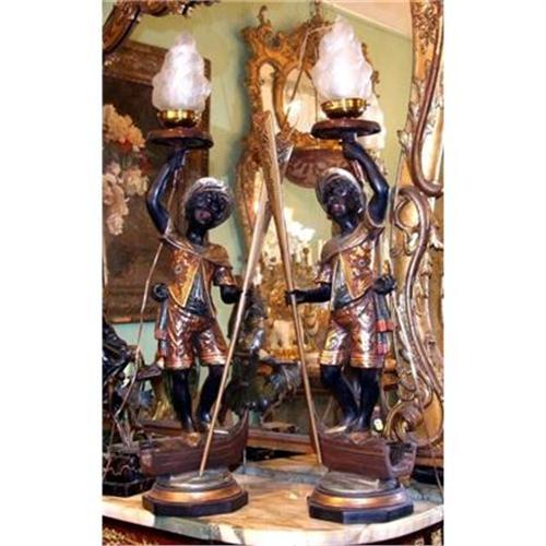 Pair of beautiful Venetian Blackamoors torcheres, table lamps or on wood pedestal(available) ,end of the 19th ,total height is 72 inches , 36 inches for the wood pedestal and 36 inches for the sculpture including the shade, the item still feature the original gold leaves gilding , at the pedestal and the sculpture , they were originally just for candles , Now they are electrified. The first blackamoors were created in Venice in the late 17th century substituting the the real people doing that job (holding candelabra), to light the entrance of the castles . Later, during the mid 1800s, Venetian artists carved some of the most impressive and graceful examples known. Shipping cost is consistent with the quality and worth.