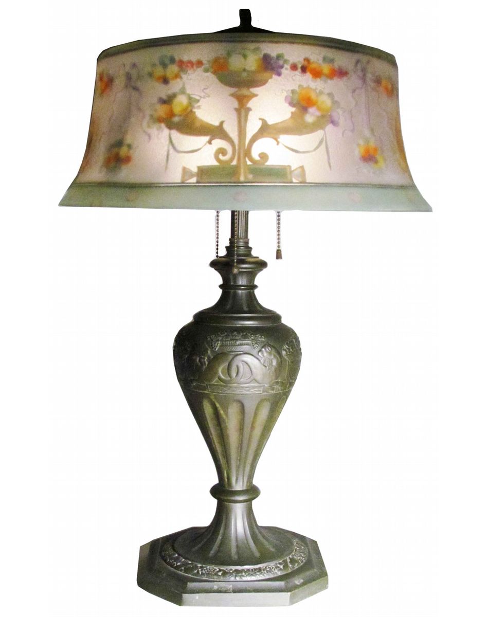 Pairpoint Deco Design Signed Lamp and Matching Base. Base marked Pairpoint D3055. Shade mark faded. Exeter shape and reverse painted with an art deco design of cornucopia and bears. Very tiny chip inside top inner lip otherwise excellent condition. Shade measures 16 inch diameter X 25 inches tall.