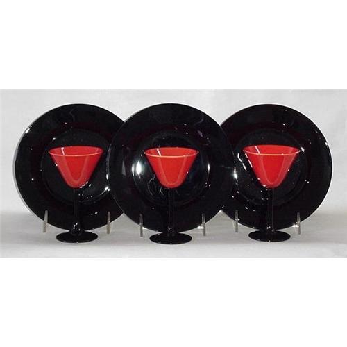 Set of 3 stemmed wine glass and 3 black glass plates. Glasses are ''Pairpoint Flambe' '', 5 1/8 tall x 3 1/8'' in diameter. Plates are: 7 5/8'' in diameter.