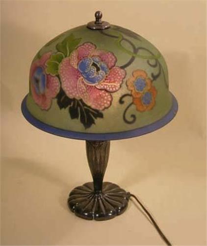 Pairpoint lamp. signed base & shade, 18" tall, two repaired chips to edge of shade.