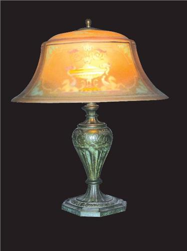 Pairpoint Lamp, taupe in color with living room pattern. Both the base and shade are spectacular in color and design. No chips or cracks. Shade 17 inch dia. and lamp is 20 inches tall.