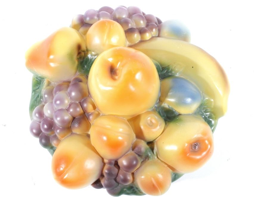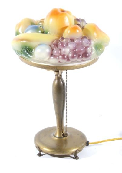 Offered in this lot we have a original Pairpoint puffy fruit table lamp. The lamp shade shows the traditional puffy glass in the shape of fruit. The shade shows grapes, bananas, apples, peaches, and a pear. The base is made of aluminum patinaed to appear as brass. The base shows elegant and simple design with four ornate legs. The lamp is marked on the bottom, reading "Pairpoint - P - 047 1/2 - 8 1/2 - Made in U.S.A." and shows a sticker reading "Lacquered - Clean only with a damp cloth". The lamp is in good condition overall with some slight wear due to age. The piece measures 15 1/2" tall by 9 1/2" at its widest.