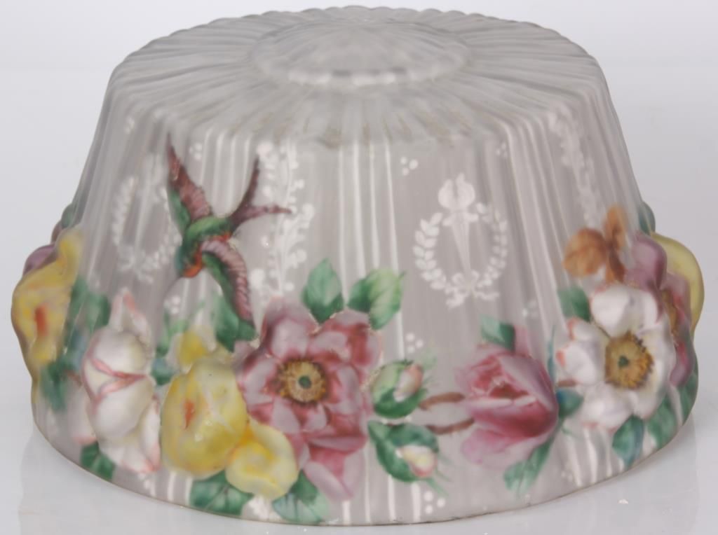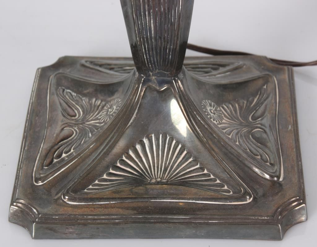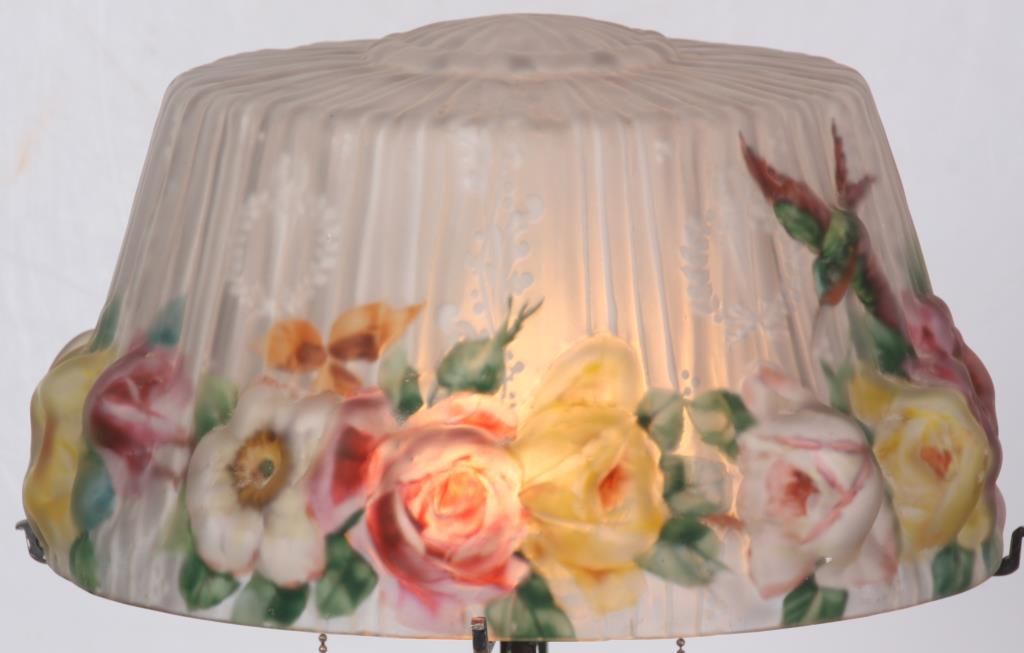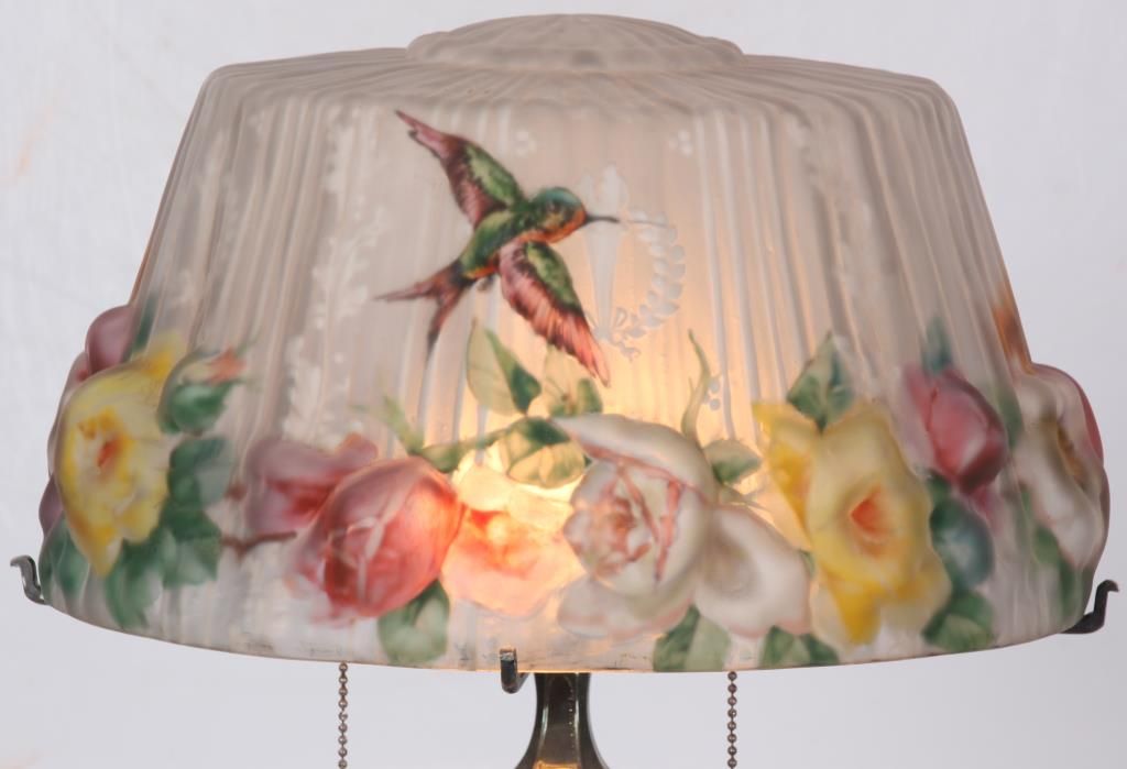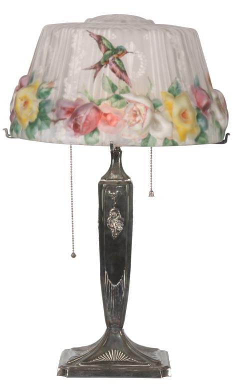 Pairpoint Puffy Hummingbird & Rose Table Lamp. 15 in. Devonshire closed top puffy shade, reverse painted with a floral cluster pattern under flying hummingbirds on a frosted and satin white pinstriped background with filigree, wreath and torch designs; shade signed The Pairpoint Corp. The silver plated base has a 4 sided stem having repousse hanging floral designs with shell and sunflower design in the sunken platform; base has a 2 socket light cluster and shade rests on 4 arms branching out from the center, signed The Pairpoint Mfg. Co. 3099. In very good condition. 23 in. high.