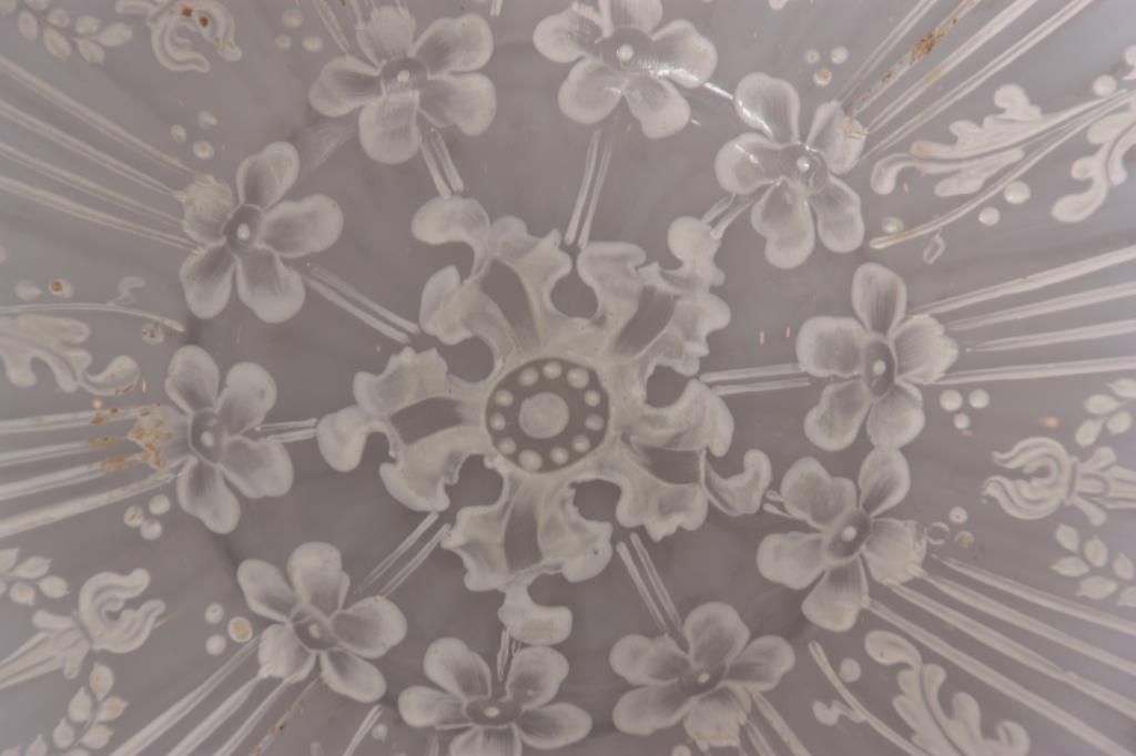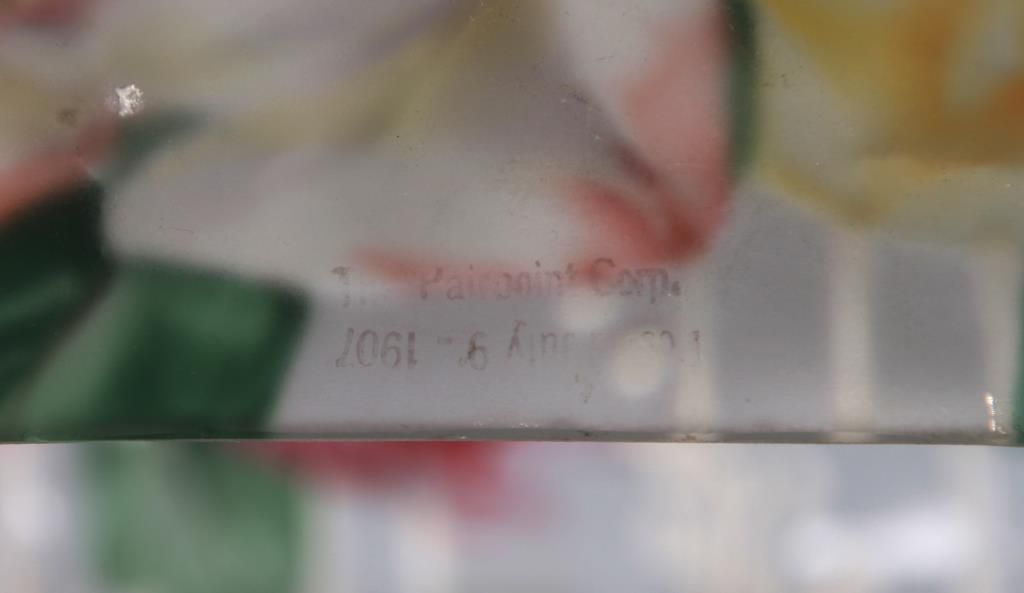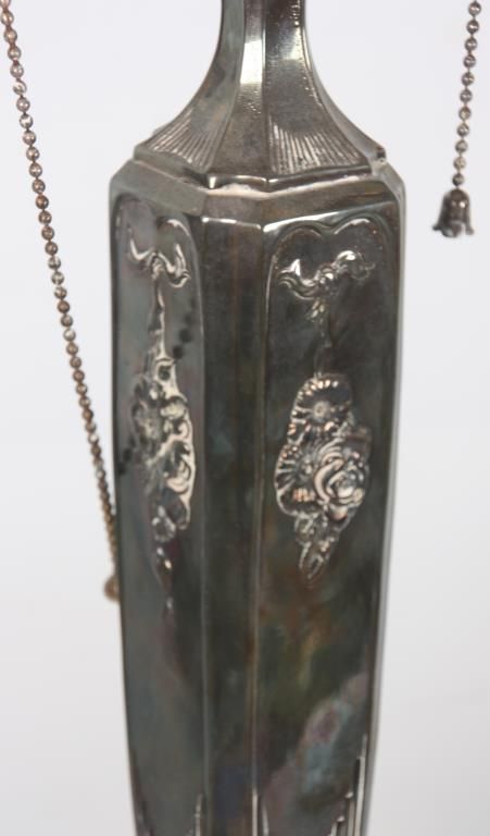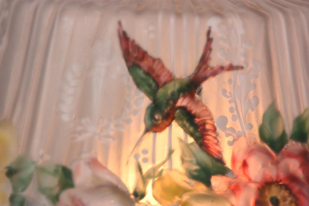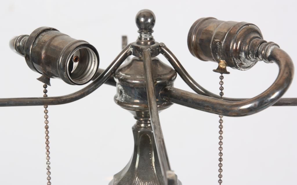 Pairpoint Puffy Hummingbird & Rose Table Lamp. 15 in. Devonshire closed top puffy shade, reverse painted with a floral cluster pattern under flying hummingbirds on a frosted and satin white pinstriped background with filigree, wreath and torch designs; shade signed The Pairpoint Corp. The silver plated base has a 4 sided stem having repousse hanging floral designs with shell and sunflower design in the sunken platform; base has a 2 socket light cluster and shade rests on 4 arms branching out from the center, signed The Pairpoint Mfg. Co. 3099. In very good condition. 23 in. high.