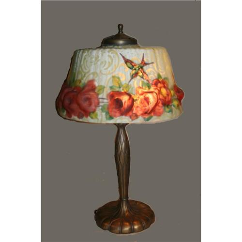 Pairpoint Puffy Lamp - Signed on base and shade.  16" D shade with roses and lace with a hummingbird in shades of pink and green.  No chips or cracks.
