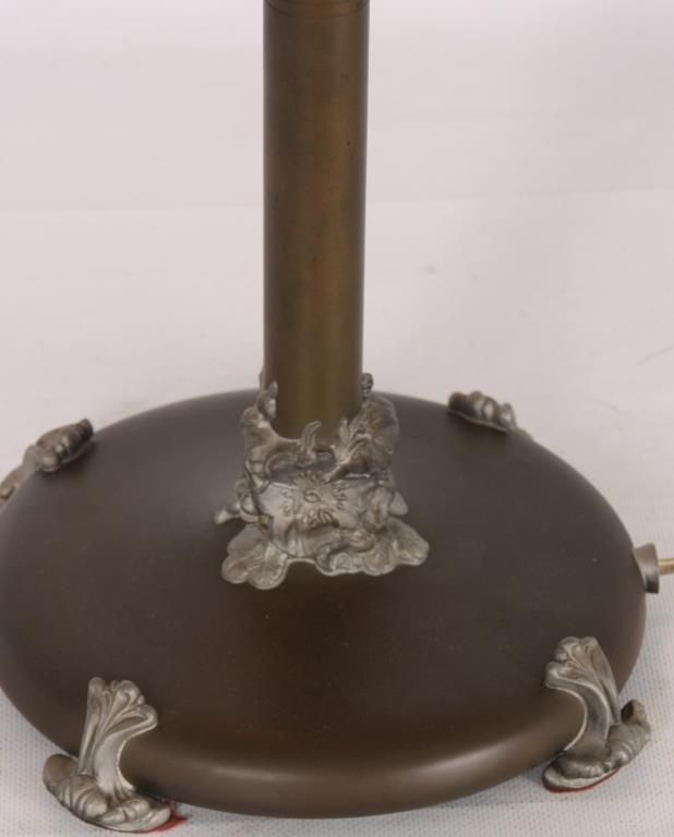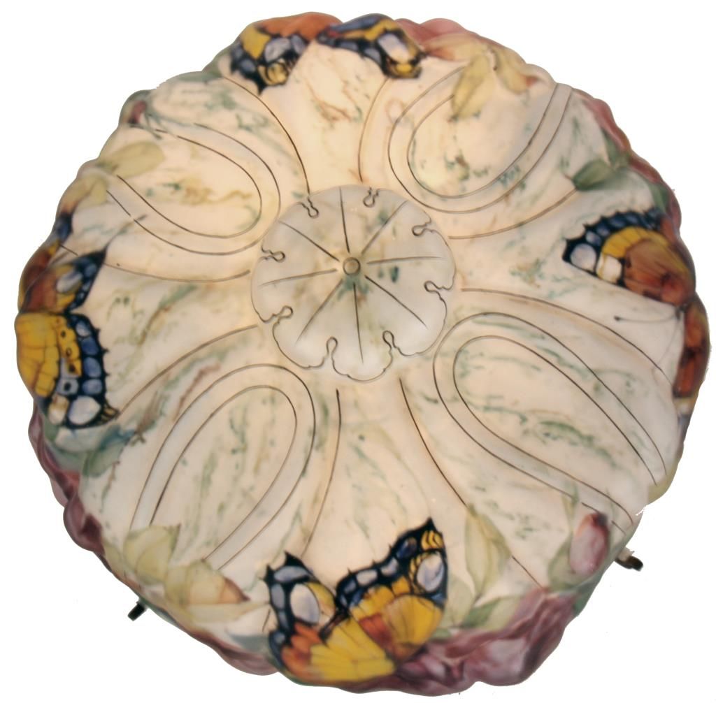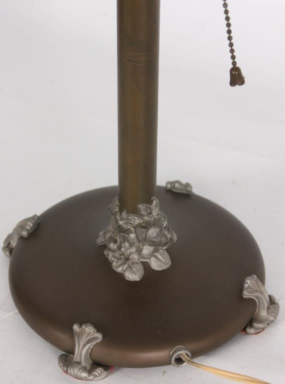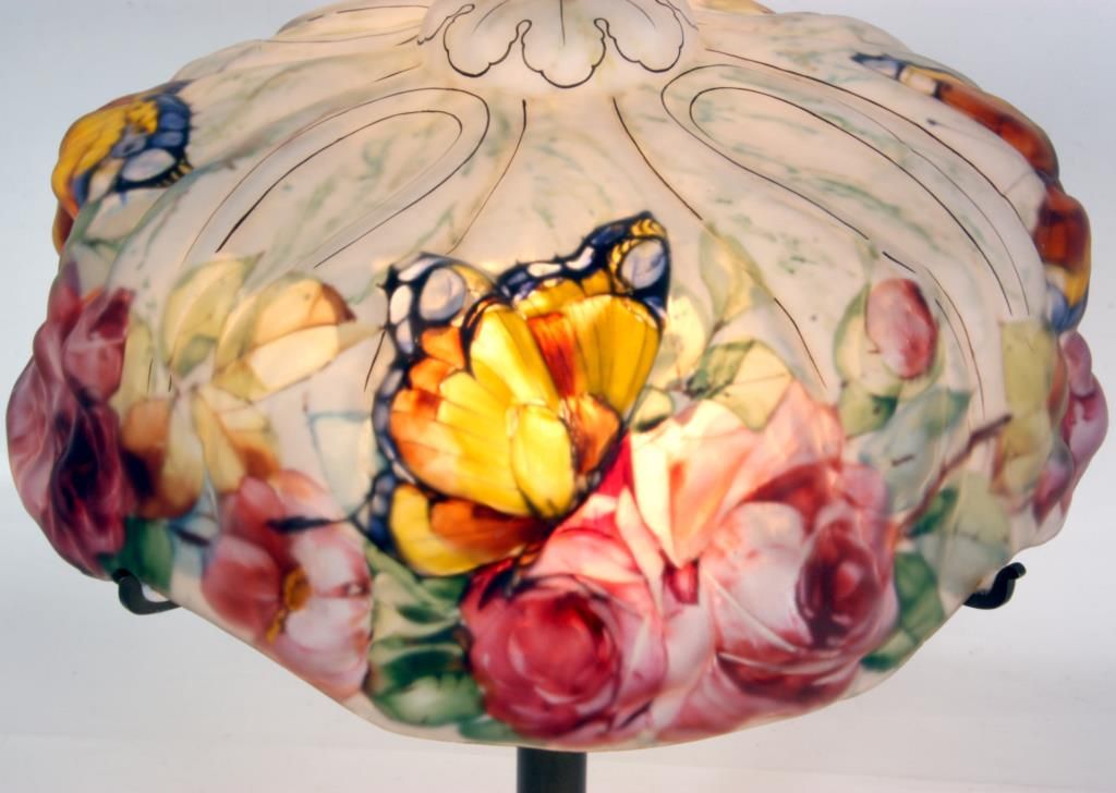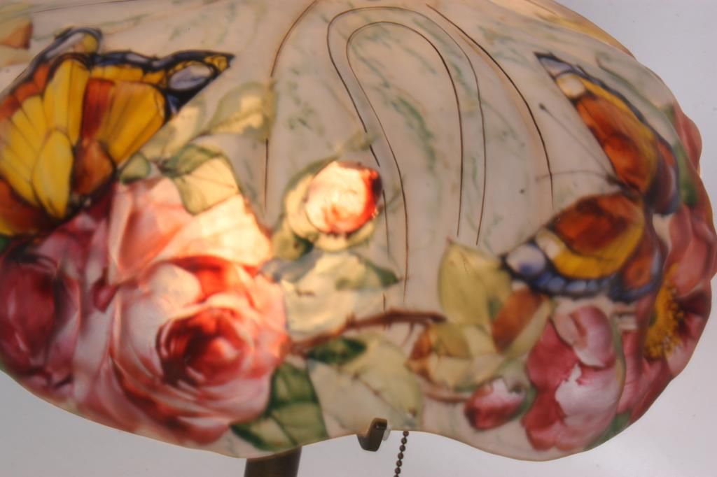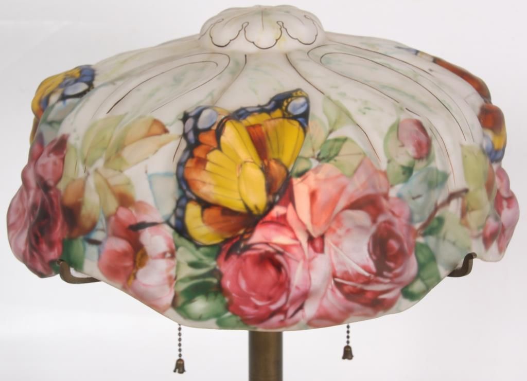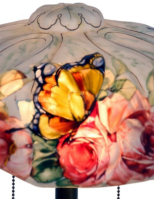 Pairpoint Puffy Papillon Table Lamp. 14 in. puffy shade, reverse painted with colorful butterflies and 4 clusters of red roses with vines and leaves on a white background; decorated on the obverse with gilt outlines. No chips, breaks, cracks or repairs to the shade. The 2 tone base has 2 sockets and a brass and silvered finish with filigree molded feet and a rose cluster at the base of the stem; the shade rests on 4 arms branching out from the center, sockets are replaced; shade signed The Pairpoint Corp., base signed Pairpoint Mfg. Co. 3093 1/2. Overall height 19 in.