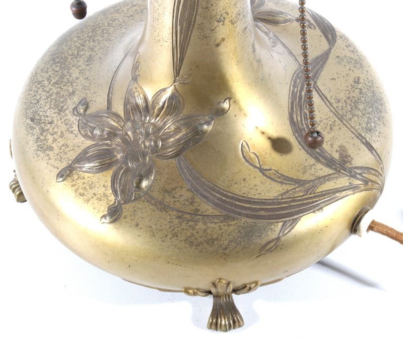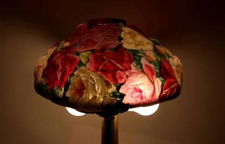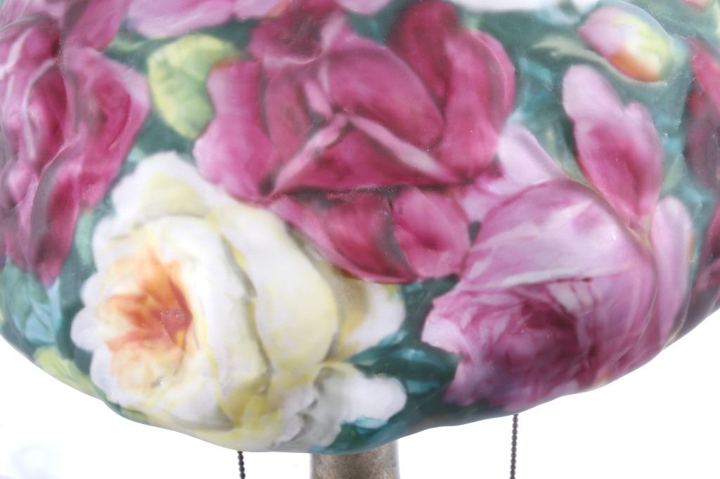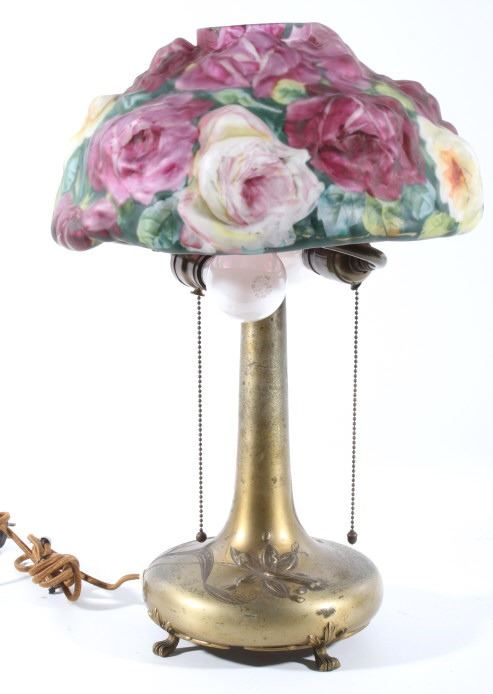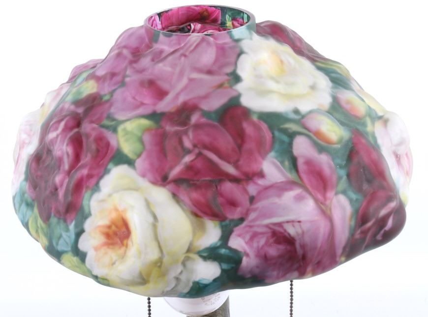 Included in this lot we have a Pairpoint puffy reverse painted floral lamp. The lamp shade shows the reverse painted images of maroon and white roses surrounded by leaves. The shade shade is textured to show the flowers in more depth. The base is made of aluminum and shows a brass colored finish. The base shows detailed engraved images of two flowers and their stems along with four carved feet. The piece is marked on the bottom , reading "Pairpoint MFG Co. - P - 3033" and a tag reading "Lacquered clean only with a damp cloth". The piece is in good condition for its age with a little wear at places. The lamp measures 19 1/2" tall with the shade measuring 13" in diameter.