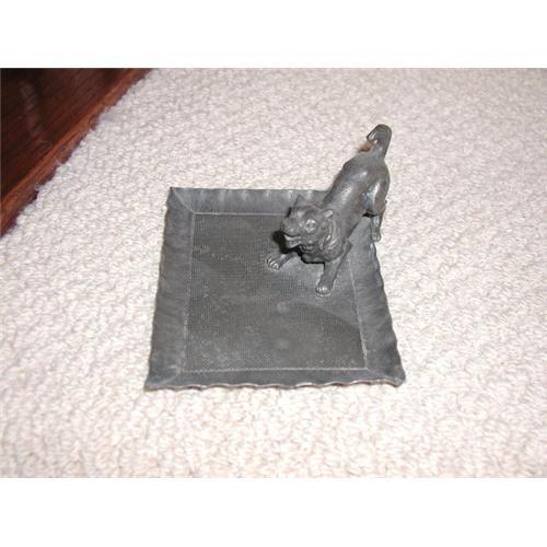 Pairpoint Quadruple plate dog card tray. Silverplate is worn off, but this is a very unique piece. Approx. 4in.X 5in. Dog is very animated. Bottom is marked," Pairpoint mng.co.