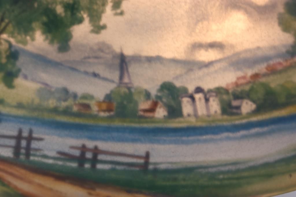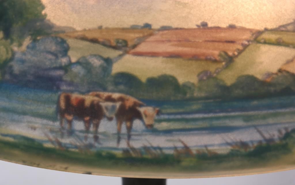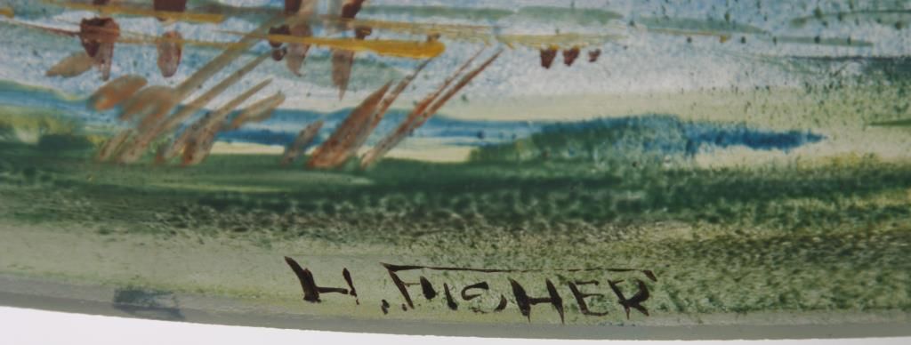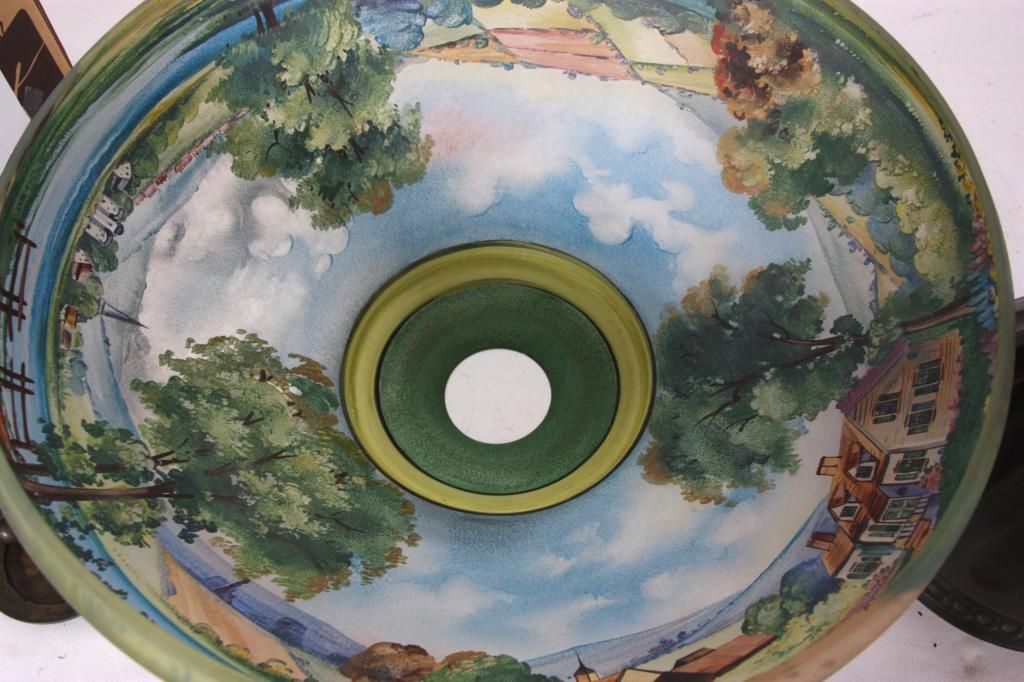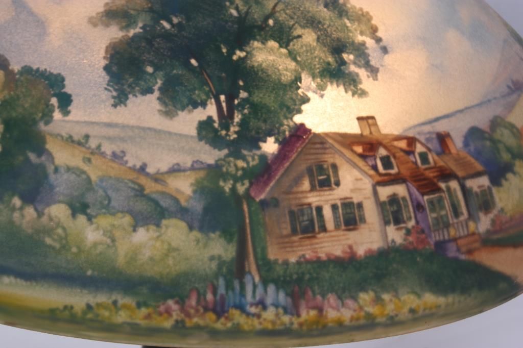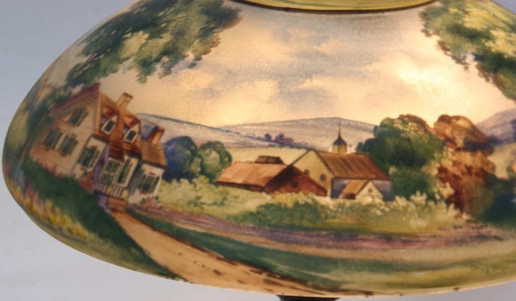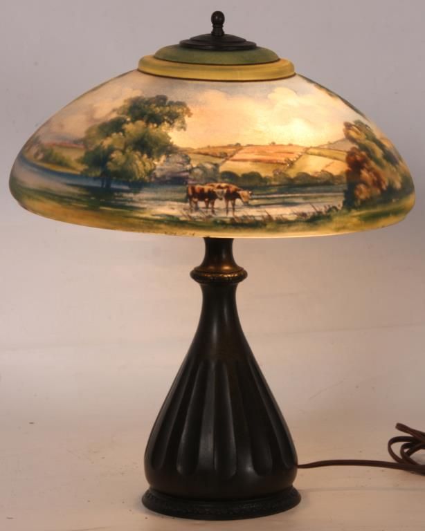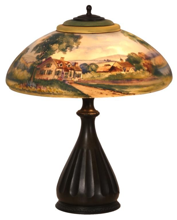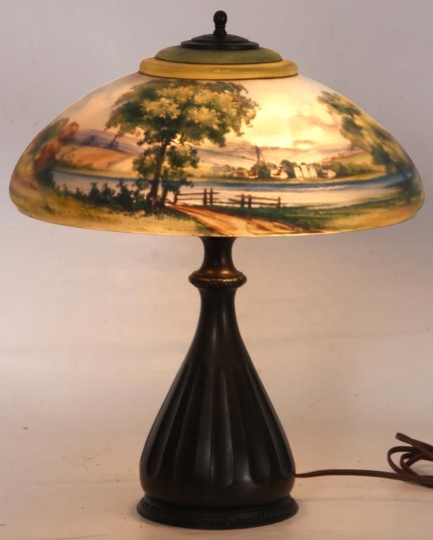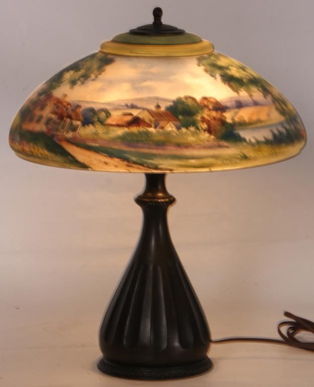 Pairpoint Reverse Painted Scenic Table Lamp. 18 in. Lansdowne style shade with lobed top and rolled lower rim, reverse painted with a country scene and townscape with lake, mountains, trees, buildings, dirt roads and rolling hills under a blue sky; artist signed H. Fisher. The base has a gourd shaped with fluted section within the body and 3 socket light cluster at the top of the stem, socket interiors replaced; base signed D3059. In good overall condition, shade has a few minor no harm flea bites on the top edge of the fitter and on the lower rim. 22 in. high.