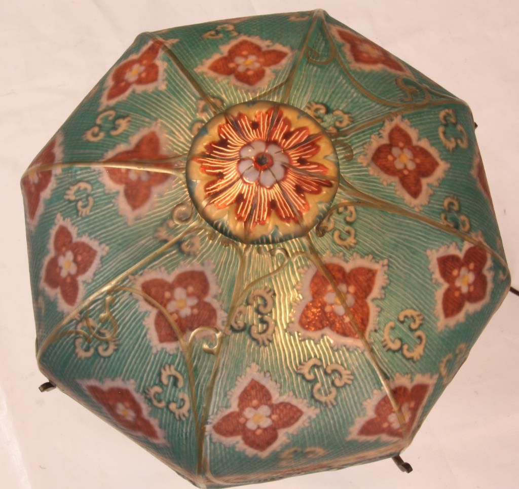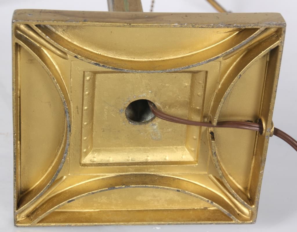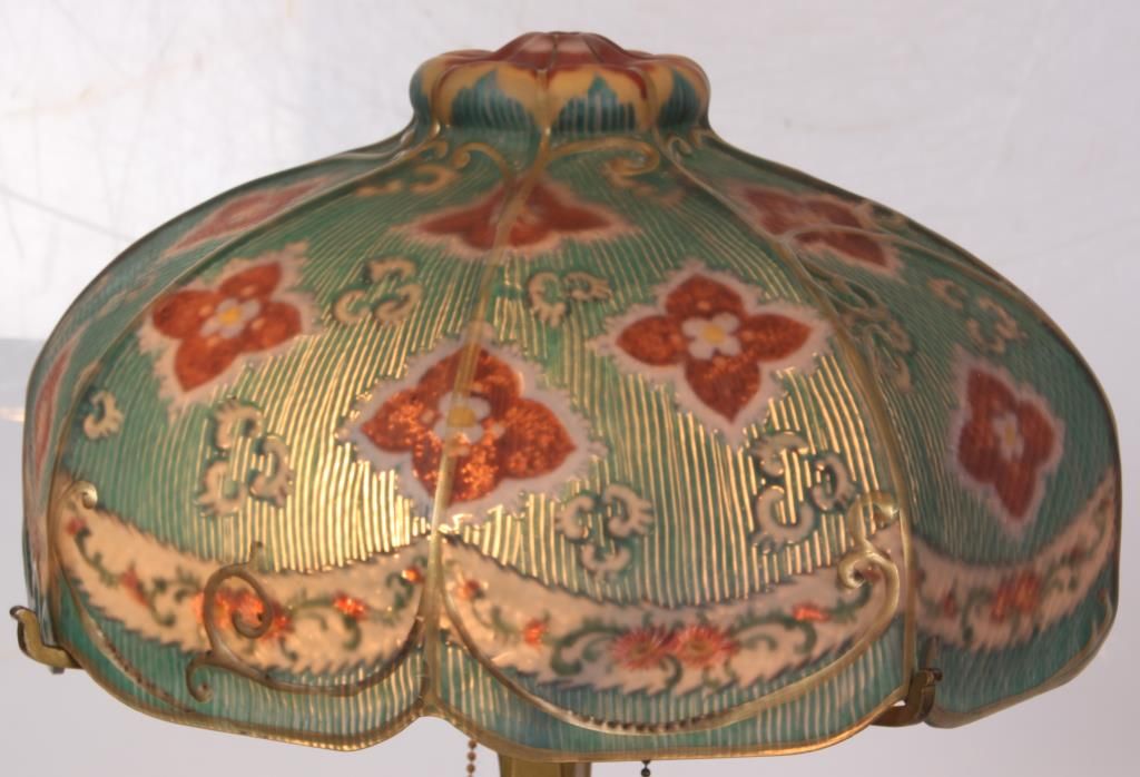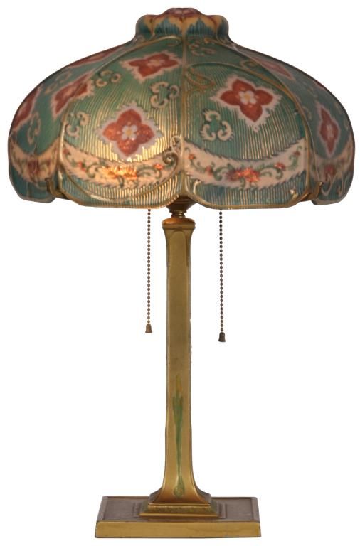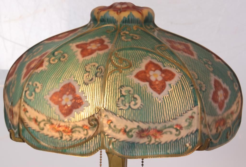 Pairpoint Reverse Painted Table Lamp. 13 in. reverse painted 8 paneled Florance shade has a quilted texture on the exterior with gilt decorated ribbed borders and scrollwork; reverse painted with red and white floral designs and a white lower border with flowers and filigree all on a teal colored background, floral design in the raised closed top. On a 2 socket Pairpoint base, has a square form with polychrome painted floral design on the stem and overall gilt finish. Shade stamped “The Pairpoint Corp.”, base signed “The Pairpoint Mfg. Co.” and numbered B3016. In good condition, base has some loss to the gold on the platform. 20.5 in. high.