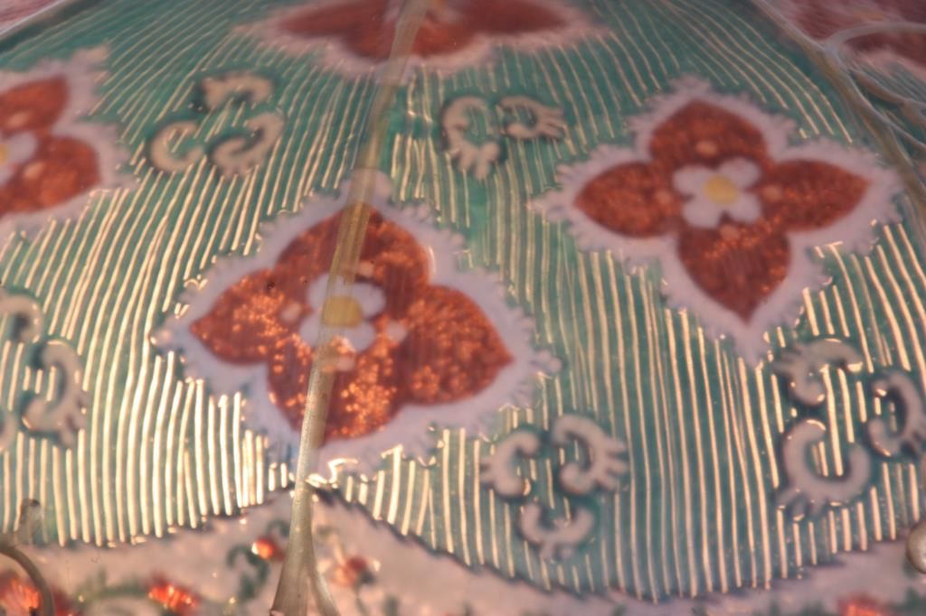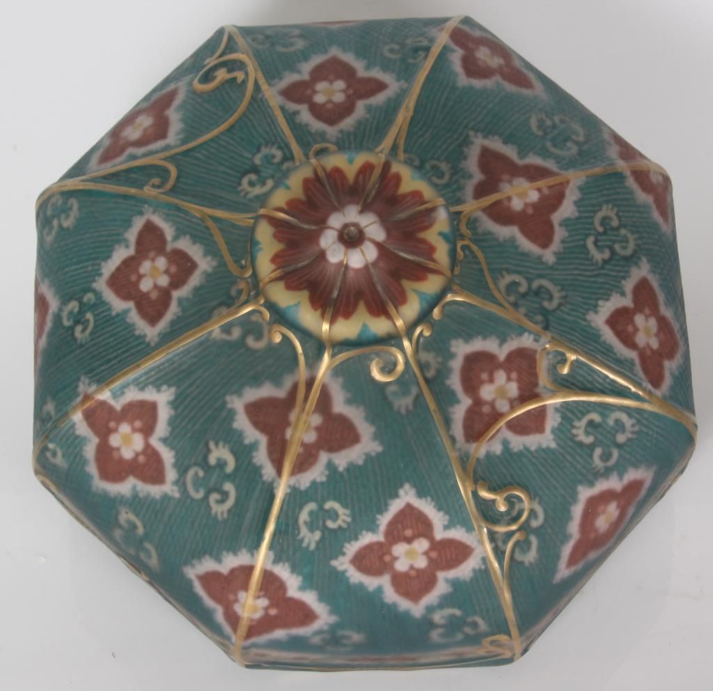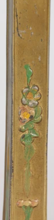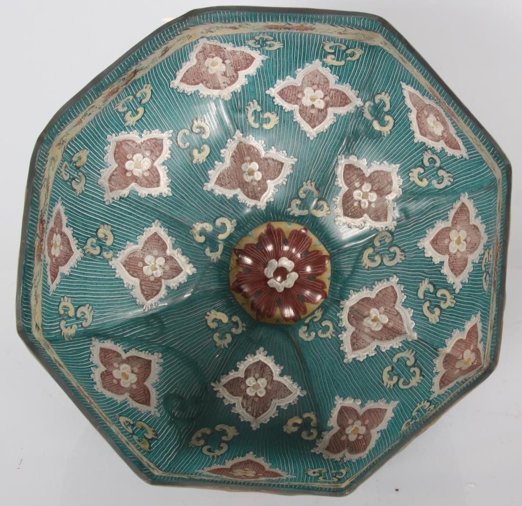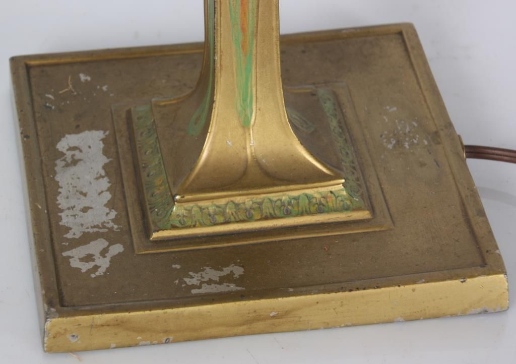 Pairpoint Reverse Painted Table Lamp. 13 in. reverse painted 8 paneled Florance shade has a quilted texture on the exterior with gilt decorated ribbed borders and scrollwork; reverse painted with red and white floral designs and a white lower border with flowers and filigree all on a teal colored background, floral design in the raised closed top. On a 2 socket Pairpoint base, has a square form with polychrome painted floral design on the stem and overall gilt finish. Shade stamped “The Pairpoint Corp.”, base signed “The Pairpoint Mfg. Co.” and numbered B3016. In good condition, base has some loss to the gold on the platform. 20.5 in. high.