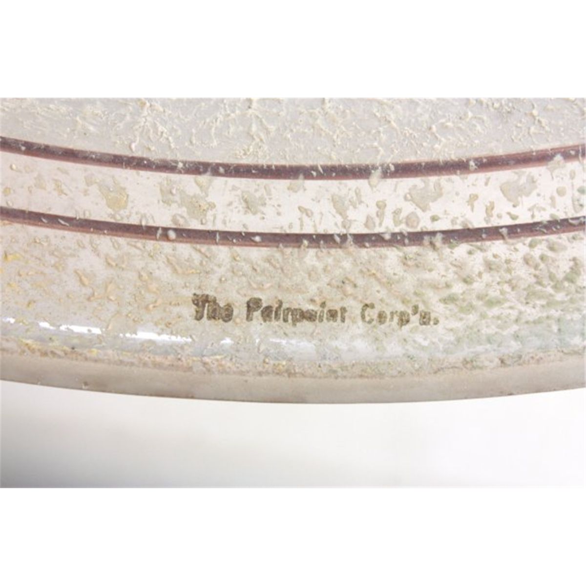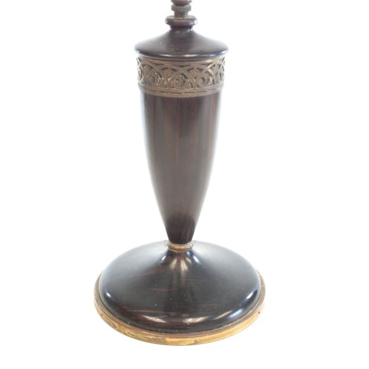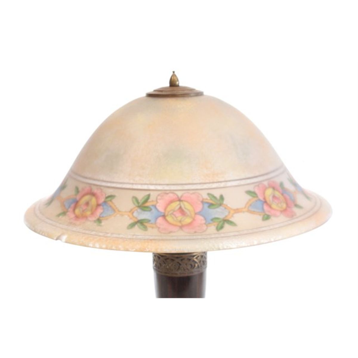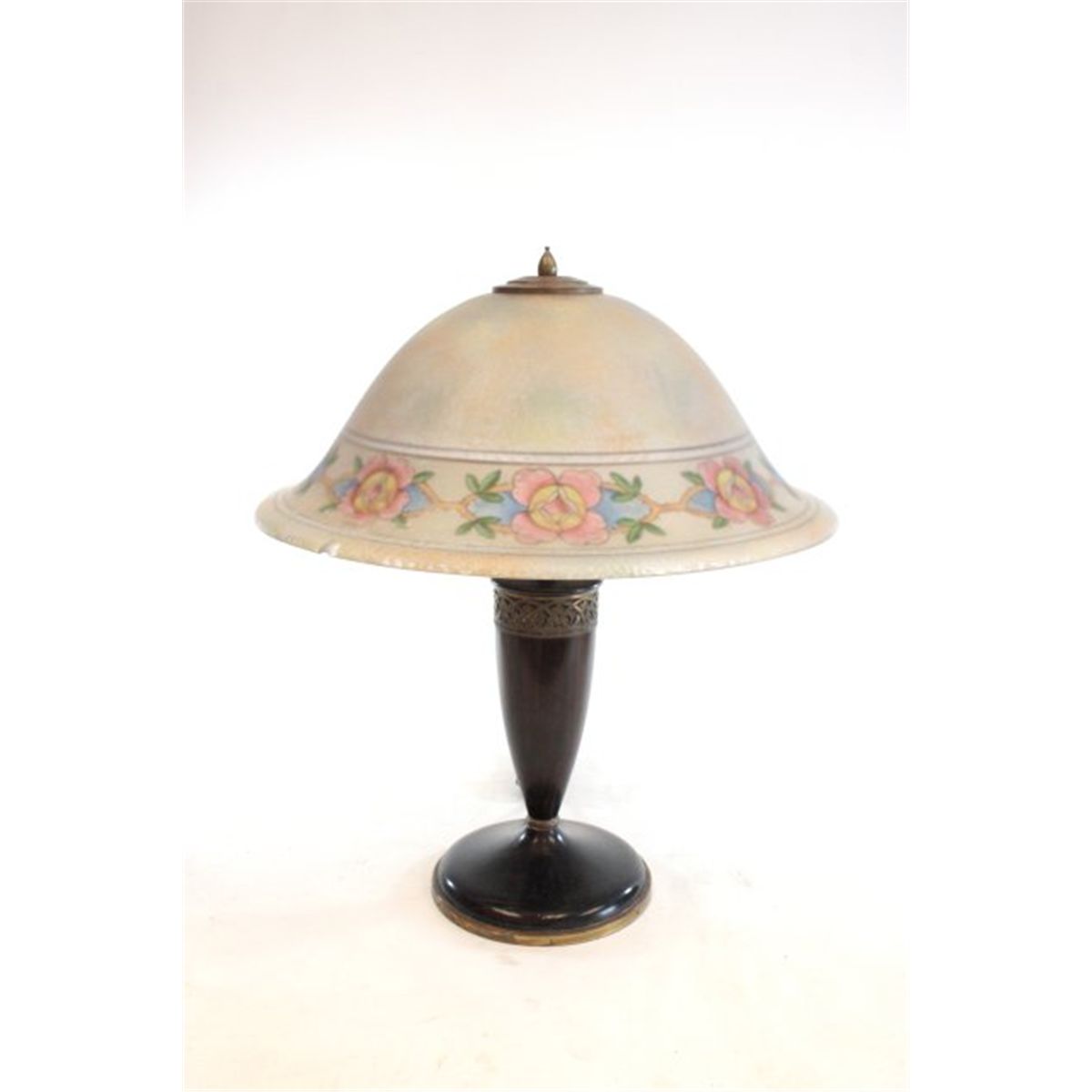 Table lamp, signed, 3 chips on rim.  Approx.  17.75" x 8" dome, 21" x 7" bronze & wood base. Please read our terms of sale.