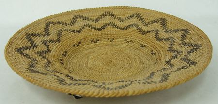 Early 1900s, Unique spaced-stitch hat-shaped tray with double snake/zigzag band. Very good condition, very minor stitch loss/damage. 2-1/2" x 13-1/2" BKT