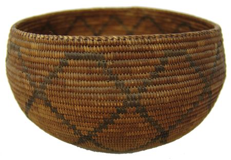 Early 1900s, Fine rounded open bowl with repeating diamond pattern. Very good condition, with very minor stitch loss/damage on rim. This is a well used piece and has a nice dark patina. 4" x 7-1/4" BKT